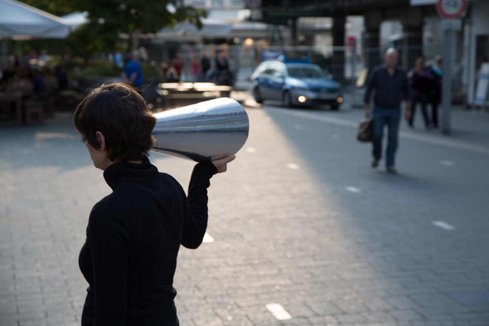 Although the cone’s sound of the cone is only audible for the person who holds the horn against his or her ear, the visual appearance of the horn drew the attention of passers-by. Sometimes they reacted by talking toward the horn, and probably they started to listen differently to the Schloßstraße because they saw somebody listening to its sounds. The main aspect of this performance is not only how much the soundscape itself changes by adding the horn, but also how our listening changes as soon as we consciously listen to something. Consequently, taking the horn and walking with it through the city becomes a performance itself. The audience member is, at the same time, the performer of the piece.