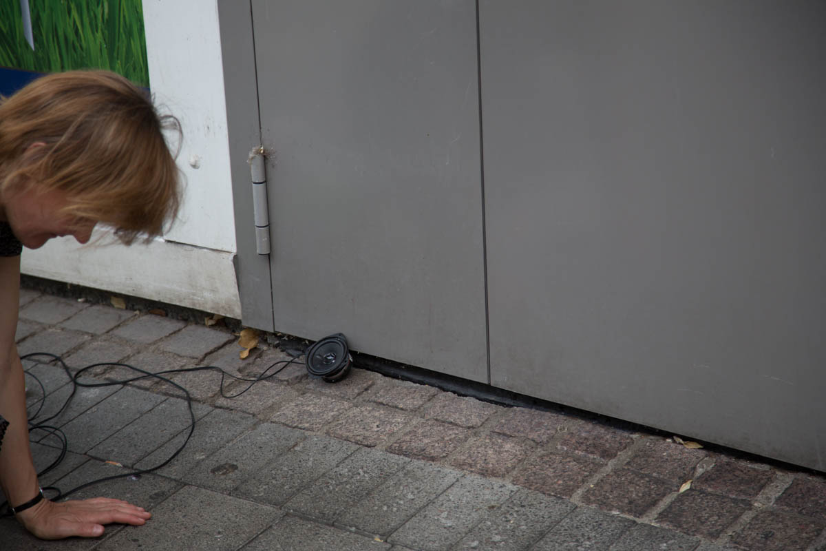 Social engagement through presence with sound art practice in the urban environment proved to be an interesting, albeit tricky topic. Not primarily because of the idea of creating an impact in the lived world, but rather because we didn’t intend to actively manipulate or engineer social situations. By being visible agents in the urban environment, for example by operating with a large microphone and a camera, by manipulating small speakers in marginal or so-called non-places or by ‘performing’ a listening walk using large cones, the public was clearly perceiving us through our activity as artists. This ‘signalling’ effect was a deliberate choice, intended to build bridges to members of the public. Whether the public’s questioning of this would lead to an active engagement frequently depended on the circumstances and on the type of person in front of us. There were many short encounters – for example with children who, with their natural curiosity, would engage immediately in questioning and try to understand what we were doing. Adults would do so in a more reserved way and usually provided their interpretations as questions: Are you measuring the noise levels? Are you a TV camera crew filming? Are you documenting the empty stores on the high street? These were some of the questions put to us. A very interesting question was asked by a teenager when watching Cathy van Eck walking with a listening cone: What is she listening to? Our attempts to answer these questions and explain our methods and goals would lead to conversations, which in once case motivated a person to join us in the common experience of a listening walk and a subsequent long discussion. These communicative moments were enabled by our being active in the public sphere in a particular manner, something that would not have occurred had we simply gone out to interview people.