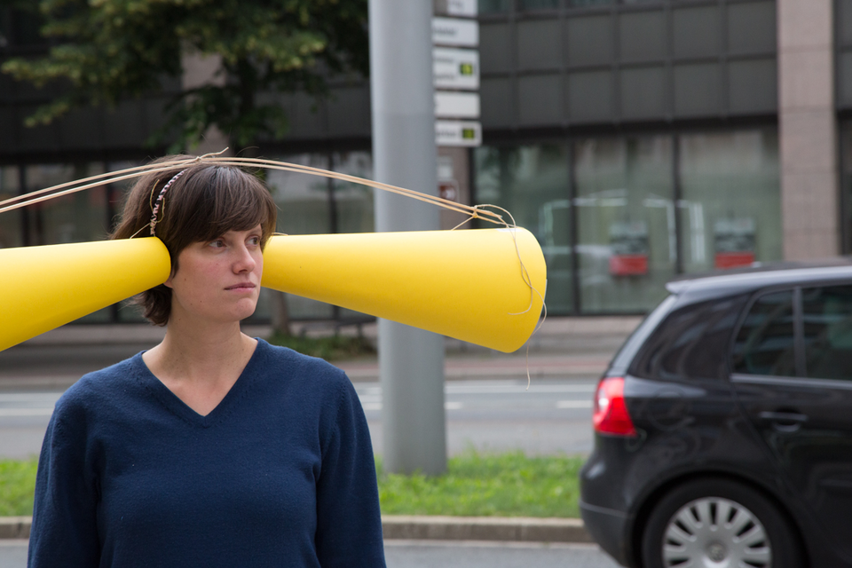 These lines were written by the Futurist composer Luigi Russolo in his manifesto The Art of Noise (1913) exactly one hundred years before we started our research project, sonozones, in Mülheim. In my part of this project I investigated how the ear could be made more ‘sensitive’ when crossing the city, as Russolo requests. In everyday life we tend to just find our way through the city, without listening much to the soundscape. Normally, the city sounds we perceive consciously are all warning signals, such as cars driving by, the footsteps of someone approaching us from behind, the clicks of a traffic light, or the siren of an ambulance. It is the second claim Russolo makes that caught my attention, though. He asks us to ‘amuse ourselves by orchestrating together in our imagination’ the sounds of the city. A compositional process should be the consequence of hearing the sounds of the city, with the result that one listens to city sounds as if they were music. It is this process that I investigate: How can ordinary everyday sounds of the city sound as if they were ‘orchestrated’, in other words, as if they are not only city sounds but also a piece of music? My research in Mülheim focussed on the border between everyday sound and music – how to cross this border and how to use this border as a valuable compositional parameter. I therefore developed three different ways of extending our ears, in this way focusing on sonic aspects of Mülheim that would normally be ignored and thus remain unheard. By modifying the ears with the help of mechanical, electrical, and virtual accessories, I looked for ways to transform ordinary city sounds into a musical composition.