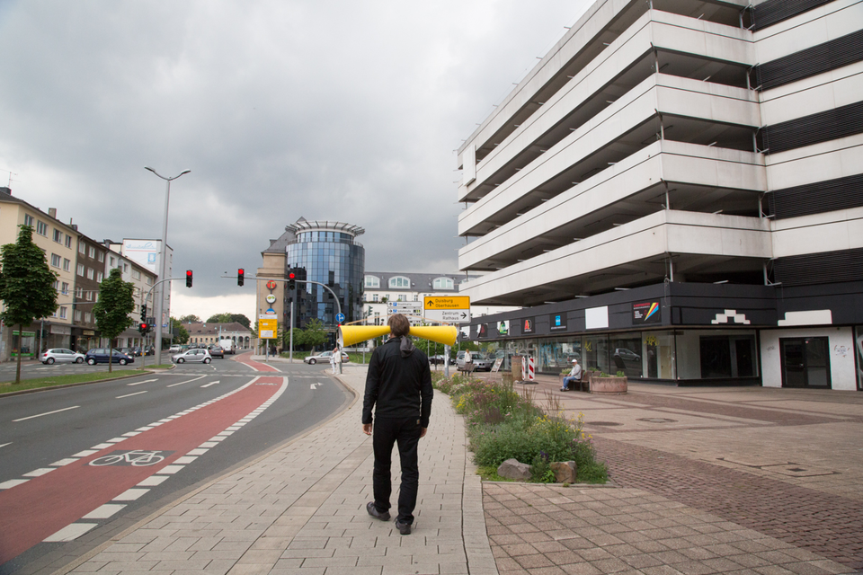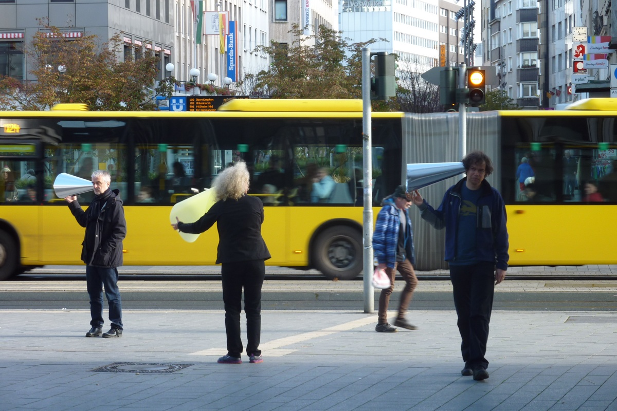 I had the feeling that in our project we worked on the method and the materials, but not so much on the pace and the connection to Mülheim – yet. We agreed that we would need to experiment with the three methods of extended ears. […] The look from passers-by and people in vehicles showed clearly that being active with thee contraptions is also a ‘performative action’ and creates a clear signal, a strong curiosity. […] One finding was that using only one funnel provides better differential hearing. My impression was that the overall perception is less disturbed and that with one ear, the horn functions more like an acoustic telescope.