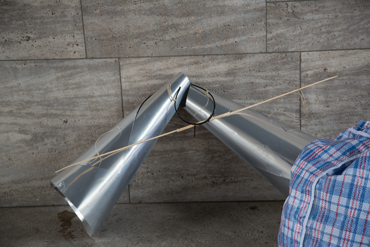 In Mülheim I tried the cones at various locations (see map): on a bridge across the river, in a park, next to a busy street with cars, and in the main shopping street. In addition, I built many different types of cones and tubes, using different kinds of plastic and cardboard. Different listening experiments demonstrated that using one cone instead of two resulted in a clearer augmentation of the listening experience. Since the listening was done only in one direction with a single ear, one was focusing entirely on the sound entering the cone, ‘closing’ the other ear. There was a clear difference as well between the two ears, one extended and one not, which brought the listening itself into focus. By using only one cone it was easier to ‘search’ for what to listen to, whether by visual or by auditive triggers. It often happened that I heard a specific sound through the cone and could then check what it was by looking at it. This searching could be accomplished better by walking through the city than when staying at one specific place. It is the listening itself that directs the walk: a new sound directed me to a new place, letting me slowly discover the city through its sounds. Speech that was normally not audible could be caught by the cone and become perceivable. Fountains, air conditioners, bicycles, and strollers all became objects that the cone could ‘catch’.