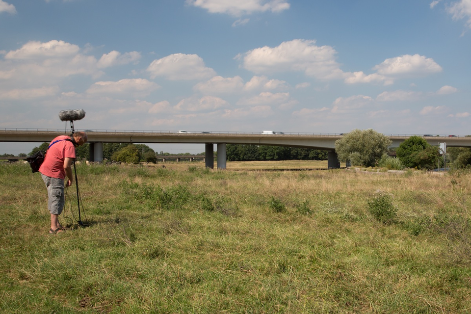 From there we walked along the footbridge leading to the power station. We stopped again half way across the footbridge, at the point where it makes an angle and creates something of a platform overlooking the river and the marshes along the shore of the island. Here the acoustic environment, or acoustic horizon, is wide enough, far enough from traffic that low-level, filigree sound elements become audible. The most dominant sonic element at that spot becomes the aeroplanes taking off from nearby Düsseldorf airport. This is something that several people we talked to commented upon (young woman during the recording with Trond in the street next to the train viaduct and the old lady on the bus stop while filming trams), especially when they thought that we were taking noise measurements.