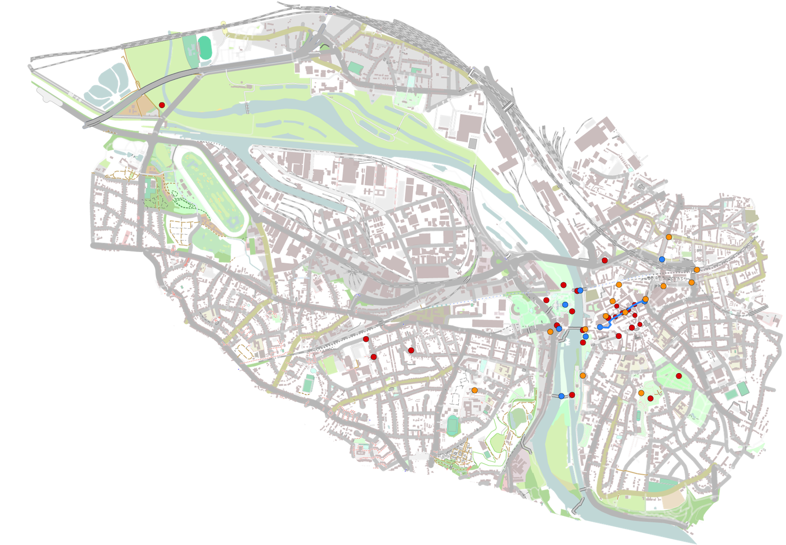 Mülheim an der Ruhr, points of significant activities. Map adapted from www.openstreetmap.org.