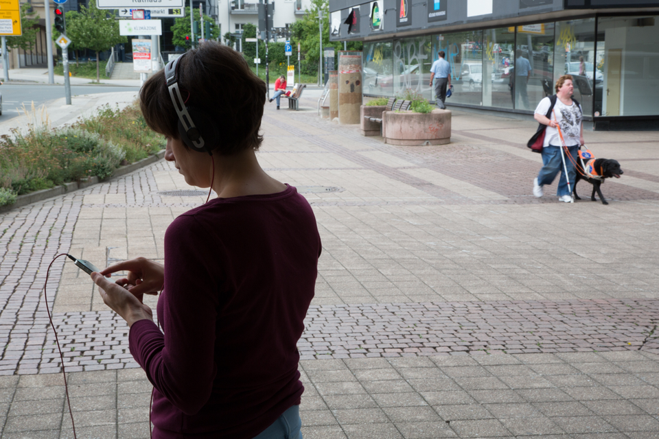 In both approaches, therefore, the composer transforms a city soundscape so it becomes music for the audience. For them, the city soundscape itself is not the music; only after framing it with either recorded or instrumental sound is the audience able to hear the musicality the composer perceives in these soundscapes. The sounds are taken out of their environment and all visual references to what caused the soundscape are lost. In contrast to these, which I call ‘musicalised’ city sounds, more direct confrontations between audiences and city soundscapes have often happened in so-called sound walks, as described by composer Hildegard Westerkamp in her text Soundwalking (1974). Westerkamp is known for executing many of these kind of walks in different environments, including city soundscapes – defined by her as ‘any excursion whose main purpose is listening to the environment’ (Westerkamp 1974). In the experiments I developed for Mülheim, I searched for a way to allow the audience to experience the city soundscape they encounter in everyday life as being ‘framed’ for music. There is no explicit translation made from the soundscape toward a musical composition, as the composers mentioned earlier did, but due to the addition of these extensions the city sounds change. A conscious modification of a sound is often typical of music. By adding small modifications to the city soundscape, I try to ‘musicalise’ these sounds.