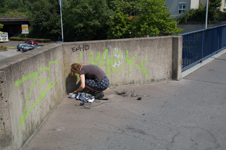 2. Because of the heavy rainfall in the afternoon, we did not realise the plan to place an intervention under a graffiti reading ‘Pussy Riot’ on a wall at Tourainer Ring with sound from the Pussy Riot cathedral performance in Moscow. This would have been another reinstallment of unedited, musical material related to the space in a more abstracted way (name of pedestrian bridge – jazz scene in Mülheim and the Ruhrgebiet in the 1950s; graffiti naming a politically significant performance – recording of that performance).