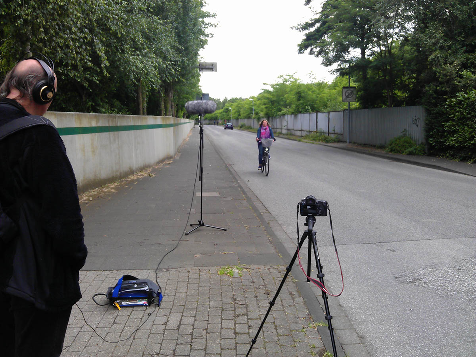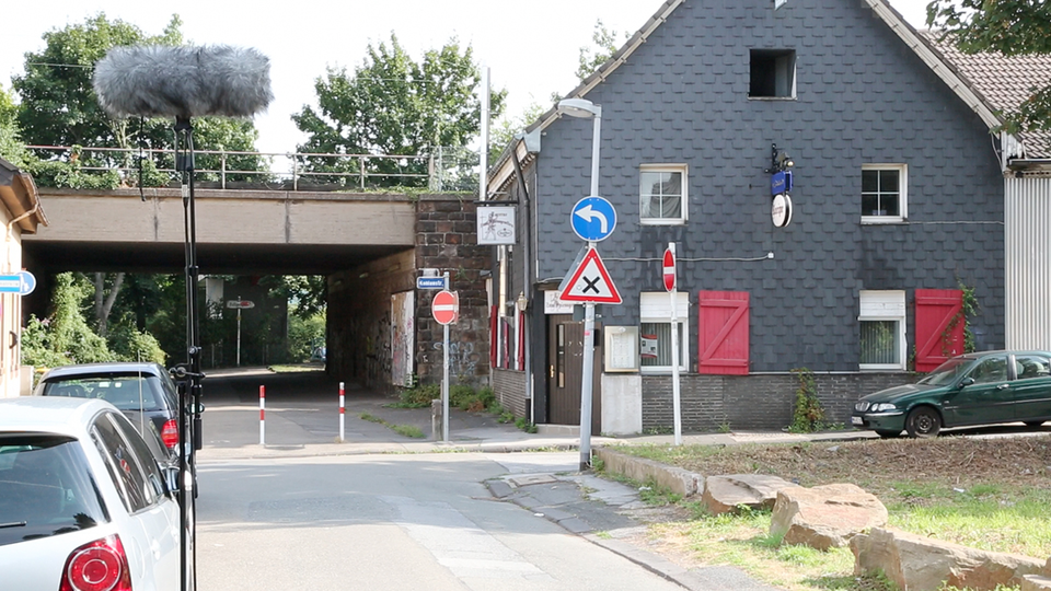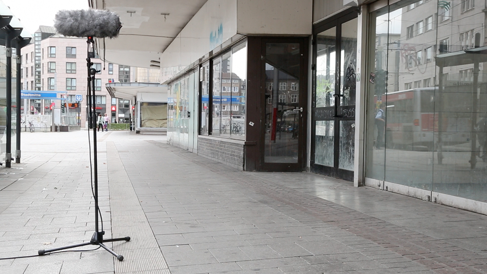 Listening through recording, using recording technology as a focusing device, and approaching the sense of space and place generated by sound and listening were the main themes of Trond Lossius’s Losing Myself in the World. Taking concepts from from the situationist ‘dérive’ (Debord (1956) 2006) as an exploratory method, we added using the microphone to listen closely to a place. The goal was to get a sense of ‘place’ and ‘non-place’ (Augé 1995), with the recordings allowing us to capture sonic elements with their spatial acoustic characteristics. During the ten days spent in Mülheim we laid a network of visits across the town, attempting to capture as many different characteristics as possible. The shared listening experience between Trond and Jan was occasionally extended when other people curious enough to inquire were offered the headphones to let them listen through the microphone, as if looking through a telescope or the viewfinder of a camera. In recording and documenting the exploratory process, a form of field recording that includes video was found, with the clearly defined goal becoming to show it in an upcoming exhibition situation in a cinema in Norway.