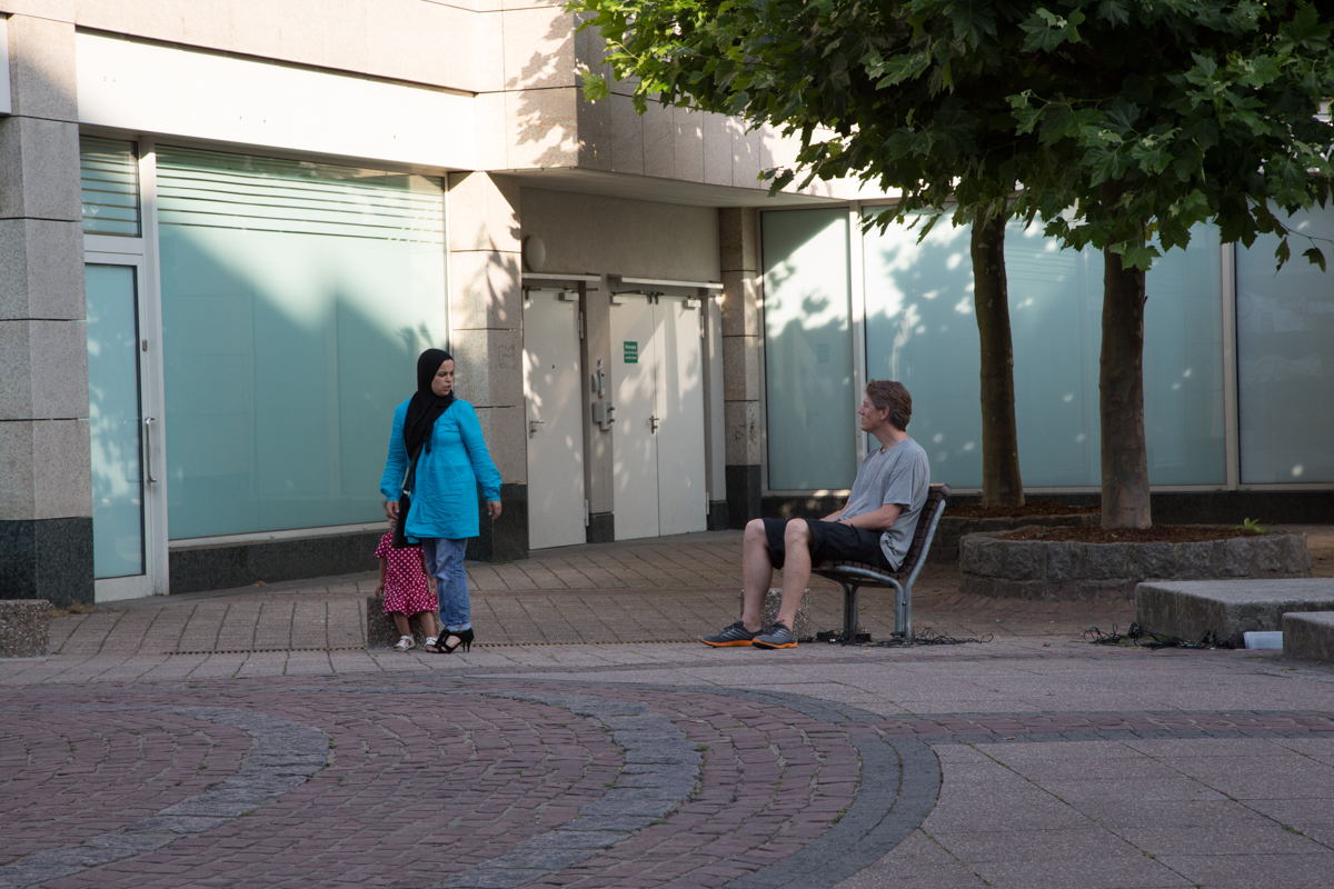 Effect/impressions: The sound for the intervention consisted of samples of original jazz music, overlaid on the four channels. Playing the music from small speakers in an outside space embedded in a soundscape with lots of traffic noise decontextualised it, which made the music appear like abstracted sound material, like a ‘sound object’ in itself, rather than a piece of music with it’s own integrity.