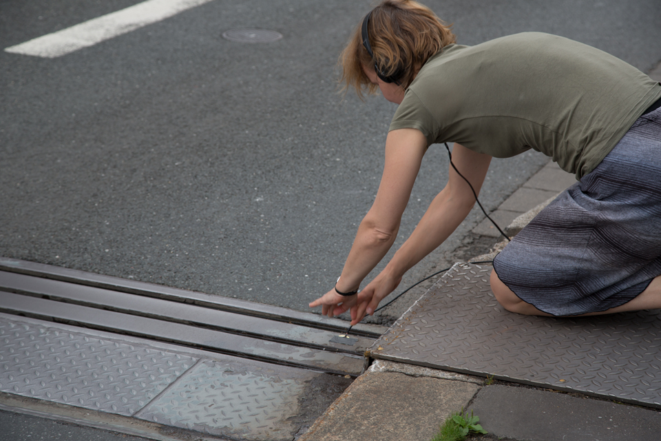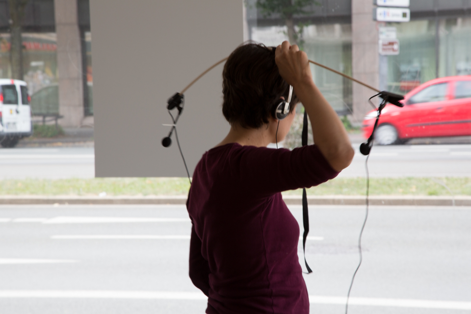 The individual perspectives, which are represented in this article as three independent sections, cover the themes of performative listening with a focus on directed or focused listening, work with installative augmentation of urban spaces by interventions with small speakers, and the exploration and experience of the ‘placeness’ of Mülheim through field recording using spatial sound capture techniques. Between the four artists, a dialogue is constituted that converges and yet exposes the many fugue-points that are present in the perspective of each artists. It’s interesting to observe how this dialogue can be positioned, related to, or recognised within each sound art practice that takes place in an urban and public setting.