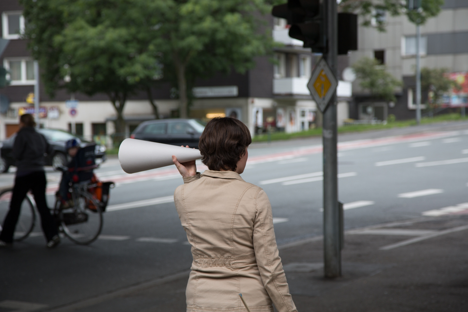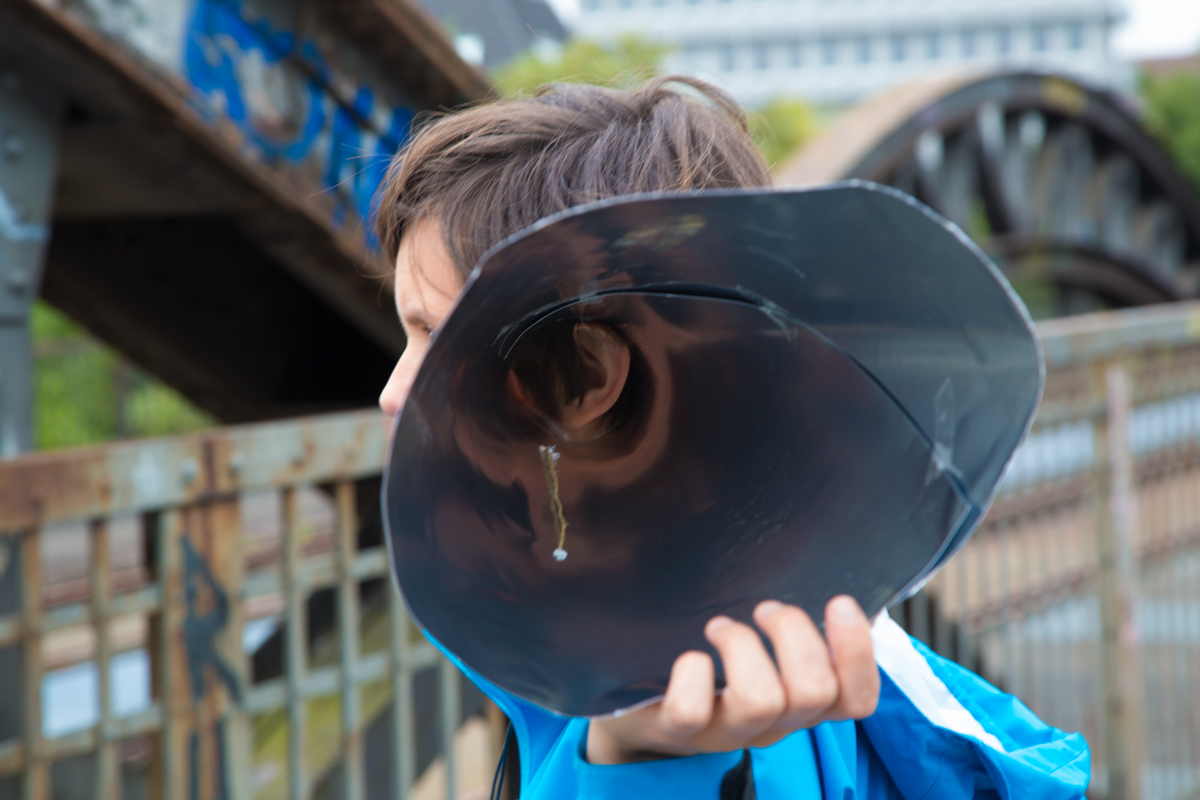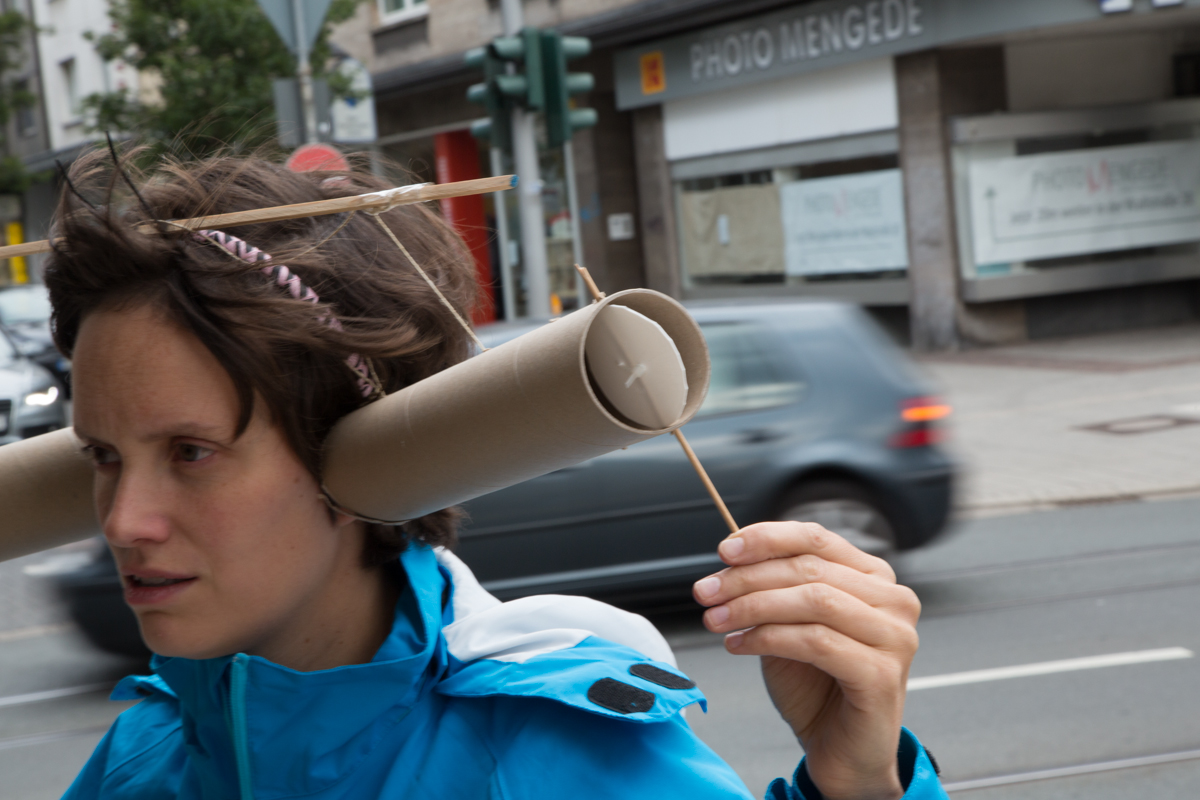 I had the feeling that in our project we worked on the method and the materials, but not so much on the pace and the connection to Mülheim – yet. We agreed that we would need to experiment with the three methods of extended ears. […] The look from passers-by and people in vehicles showed clearly that being active with thee contraptions is also a ‘performative action’ and creates a clear signal, a strong curiosity. […] One finding was that using only one funnel provides better differential hearing. My impression was that the overall perception is less disturbed and that with one ear, the horn functions more like an acoustic telescope.