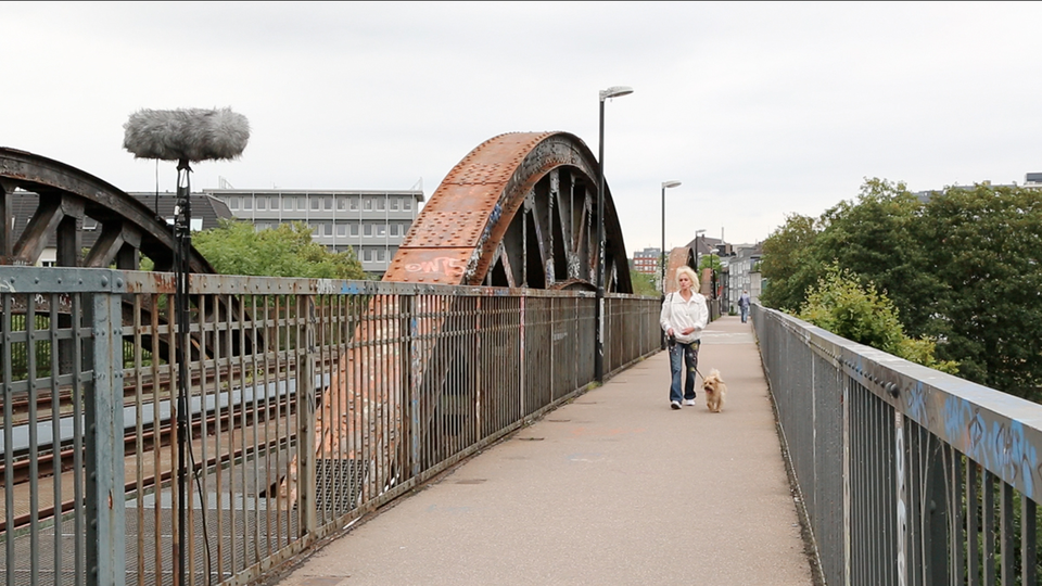 From there we walked along the footbridge leading to the power station. We stopped again half way across the footbridge, at the point where it makes an angle and creates something of a platform overlooking the river and the marshes along the shore of the island. Here the acoustic environment, or acoustic horizon, is wide enough, far enough from traffic that low-level, filigree sound elements become audible. The most dominant sonic element at that spot becomes the aeroplanes taking off from nearby Düsseldorf airport. This is something that several people we talked to commented upon (young woman during the recording with Trond in the street next to the train viaduct and the old lady on the bus stop while filming trams), especially when they thought that we were taking noise measurements.