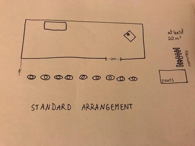 The main player who was in the interview re-enters the space and establishes his/her CRD room,as a scetch of her/his home with a standard arrangement: A table, some chairs, and a mattress. Lighting and sound are also available. The decoration is limited to a minimum. The audience space are chairs, forming a line around two meters ahead of the tape what marks the play-field. Theatre-style.