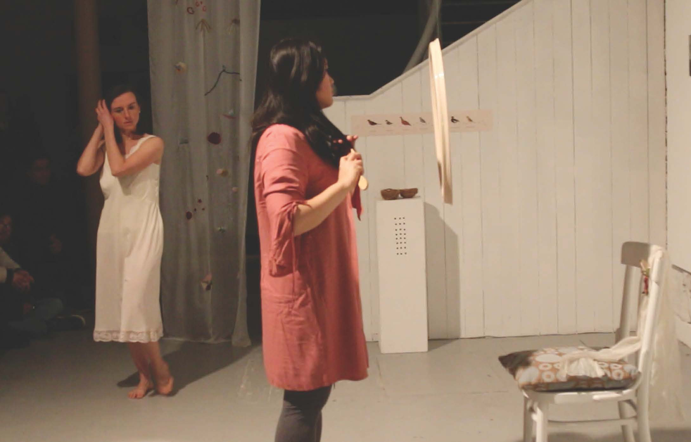 The core themes discussed in my analysis evolved from a process of intertwining live narrative over edited film footage documenting the layers of improvisations of the performance piece, and later adapted as screen-dance, Silent Pact (2018). In folding layers of movement improvisation with oral narrative, I am interested in allowing the semantics of the work to speak back to me, producing knowledge about my compositional process that moves between the artistic and the academic register. My artistic research interest lies on finding ways to amplify the affectsof dance improvisation. For that purpose, I oscillate between movement and orality as a technique to elaborate and gain awareness on the affective experience of dancing. Moreover, my performance-making process involves the creation of aesthetically stimulating spacesthat I inhabit using dance improvisation. Thus, the movement material emerges from a relational dynamic with the materials and objects organised within this constructed environment of materials and objects. In the process of critically engaging with my choreographic process, I apply the framework of relational movementproposed by Erin Manning (2009, 2013).