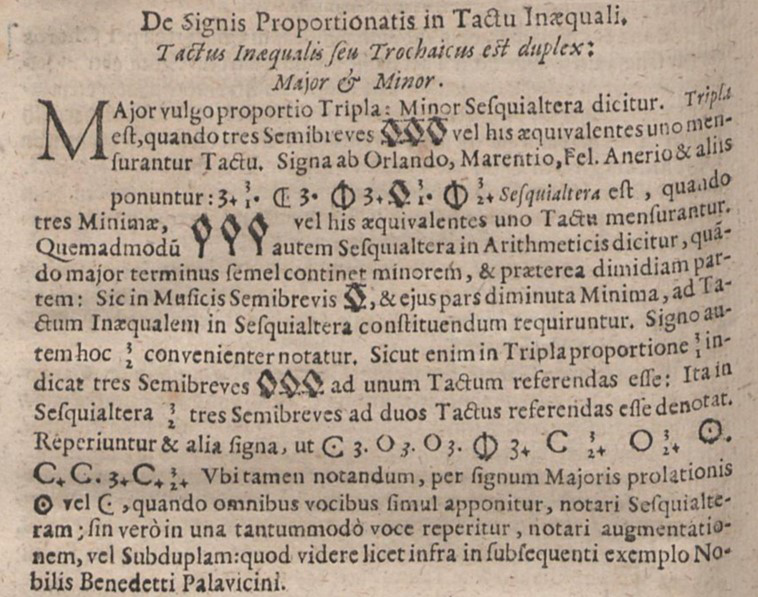 On this page he explains and demonstrates firstly the diversity of symbols used by his contemporaries to indicate tripla (3 in the time of 1), and then shows a similar variety used to indicate sesquialtera (3 in the time of 2). Note that there is some overlap between these symbols, which makes their interpretation even more problematic.