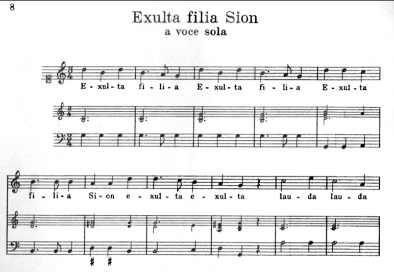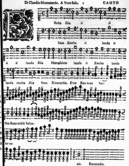 A good example of such ‘convenient dismissal’ of notational evidence is found in Malipiero’s edition of Monteverdi’s Exulta, filia Sion (published in the supplementary 17th volume of his complete Monteverdi edition in 1966). As a nod to scholarly convention we can see at least the original clef is C1, but the piece is transcribed here in a modern 3/4 time signature with no further explanation.