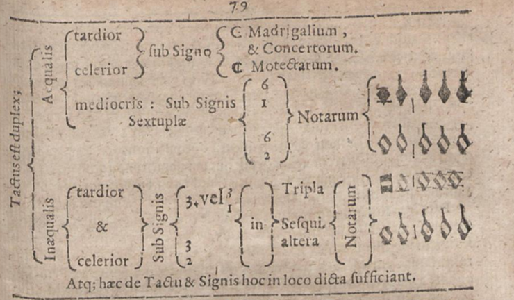 ‘To theorists of the time [early 17th Century], including Morley, Zacconi, Banchieri and Michael Praetorius, the primary system inherited from the past was still in good working order. Coloration, sesquialtera, tripla (and now sextupla) meant what they had always meant, and Praetorius in particular advocated a severe pruning of the symbols used in his day so as to clarify the basic simplicity underlying the system.’[6]