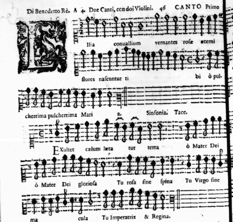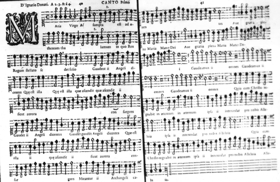 Next, here is Maria virgo by Donati, who uses a slightly different notation to indicate the same relationship – here he uses a circle, indicating tempus perfectum (but still with semibreve tactus) and then 3/1 as tripla proportion, three in the time of one. The audio example begins in the second system of the second page.