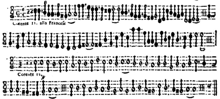 But we also see the beginnings of modern, orthochronic time signatures by 1629. The following example is from Martino Pesenti’s second book of correnti alla francese in which all the pieces are written ostensibly in 3/4 (although the signature is missing a denominator to this effect).