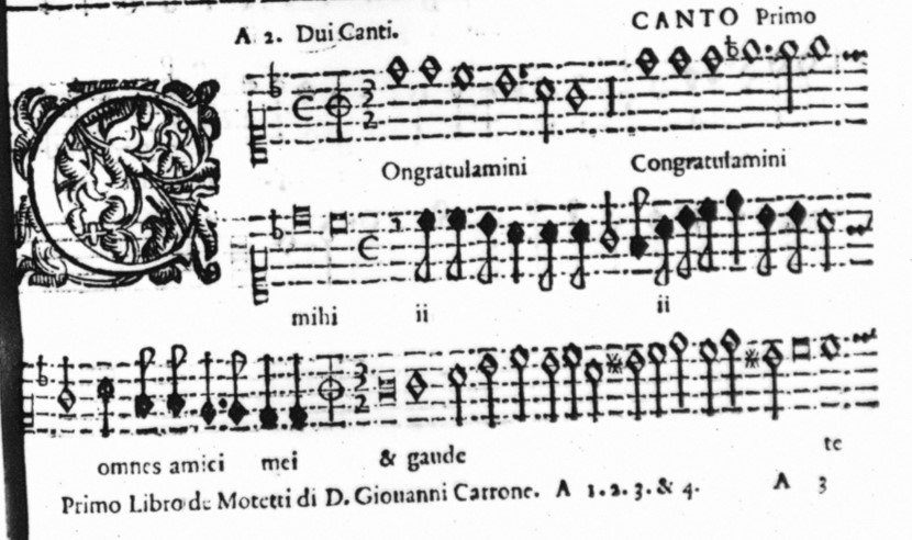 Now here’s something that on the surface suggests a rather more complex relationship. Carrone gives us C (semibreve tactus), followed by a circle (tempus perfectum) bisected by a vertical line (a sign of diminution, so the tactus now shifts to the breve), then a sesquialtera proportion of 3/2. So that’s three semibreves in the time of two, under a breve tactus for the triple section – which is equivalent to the semibreve tactus in duple time. The net result of that is the same tripla relationship as we had in the previous examples, just notated in a rather more convoluted way. But nevertheless, there is a logic to this sequence of symbols, and when we understand that logic it is clear that the composer was trying to indicate a very precise proportional relationship between the duple and triple sections.