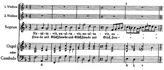 First, Schütz’s Exultavit cor meum. Below is an extract from Rudolf Gerber’s edition in the Neue Schütz Ausgabe (1957), following which is an extract from the original print. We can see that note values have been reduced in the modern edition and the time signatures changed, which obscures the intended proportional relationship indicated by the original. That’s a pity, because Schütz is entirely clear in his use of notation here.