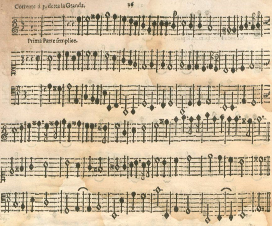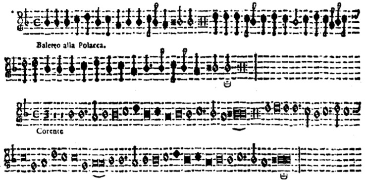 Several printed collections from 1629 include dance music. Marini’s opus 8 is one of these, and it is interesting to observe that he thought of dance movements in similar proportional terms. The following four examples illustrate duple time, tripla, sextupla and sesquialtera proportions respecively.