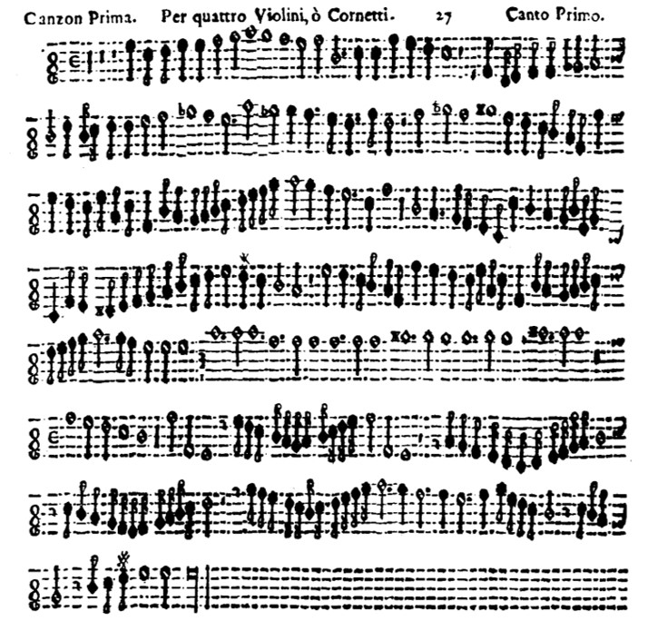 And here is Marini’s Canzon prima for four violins or cornetti, in which he gives us a straight 3/1 tripla proportion, with no additional symbol. The audio example begins in the fourth system.