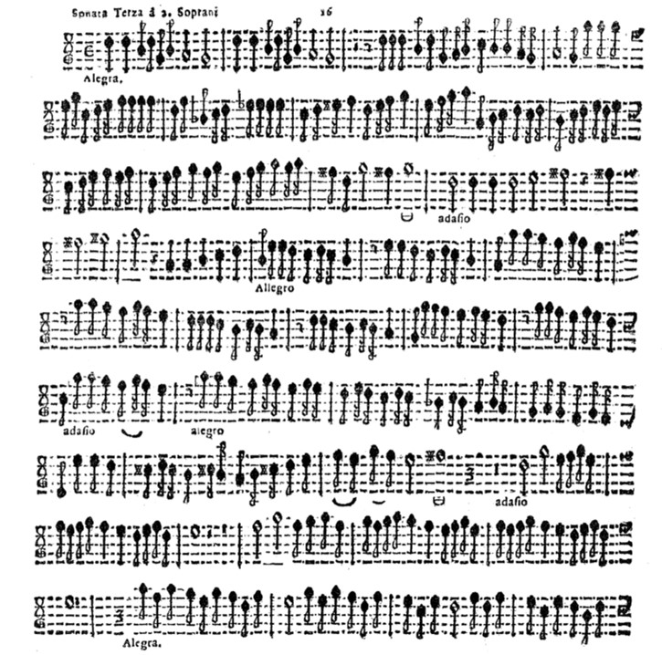 Now we come to Dario Castello, who is one of the first to use terms such as Allegro and Adagio to indicate variations in tempo. Castello was of course working very much in the same notational tradition, and so I would argue that these terms can best be understood as modifiers of the usual proportions in relation to tactus. In the following extract, the proportional relationship implied by the numerator ‘3’ (missing its denominator) is most likely sesquialtera (3 minims in the time of 2). Adagio seems to be an instruction to play a little slower than a strict sesquialtera; whereas the allegro which follows is an indication to play a little faster. The audio example begins in the sixth system.