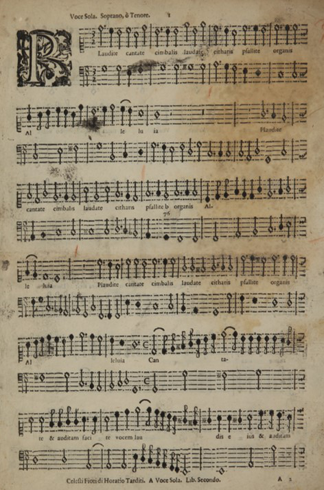 Another sextupla relationship is implied in the next example, by Tarditi. Here we have three minims per half tactus. The compound duple meter is emphasised by regular barlines. Note the frequent hemiola patterns indicated by blackened notation in the bass; it would not have been possible to indicate these shifts of accentuation in smaller note values. The audio example begins in the fourth system.