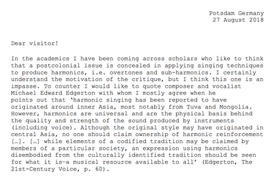 The piece was recorded in a dry, almost non-reverberating space. The walls were covered with cloth to prevent the sound from travelling through the space and creating unwanted reverb artefacts. Often, in such an arid sound situation, it is a challenge for the singer to perform in. Usually, harmonics (overtones as well as subharmonics) are reinforced when being bounced back from the surfaces (walls, floor, ceiling, etc.) of the performance space. In a resonating space, like a church, it is easier to produce and to amplify (in a pure acoustical sense) the harmonics. Each architectural environment provides its own frequency characteristics enhancing certain frequency responses while others are lowered. According to the given acoustic premises, the singer, once received, can put an emphasis on the heard frequencies or, in other words, the feedback from its own voice and, by doing so, is able to reinforce the harmonics. Most of the time, unless the singer decides to focus on the opposite, this happens automatically simply because earthly beings, as we are, are trained to be tuned into the sound environment they are momentarily staying in. Additionally, the singer has no comparison between the actual, reverberant space s/he's in, on the one hand, and the sound-insulated, laboratory-like studio situation, on the other. In the case of the latter, the singer is forced to rely on her/his singing experiences as bodily perception only, focusing exclusively on the muscular apparatus of the entire voice components and the memory for the interplay of the involved body parts. In any case, of course, this is a premise that is always required. But what's missing is the simultaneous and additional procedure of also listening, during the vocal performance, to one's own voice in the room performing in. In addition, what the singer then tries to track down is to answer the question — through the actual performance act — how the voice reacts in and to the acoustical conditions of the given space. Despite the fact that every single voice bears its own, idiosyncratic sound properties, is characterised by an unrepeatable uniqueness, as Adriana Cavarero puts it in her book For more than one voice, and therefore is distinctively recognisable, the voice always reveals itself different in regards to its sounding qualities which are determined by the dependence on the physical and mental state of the singer, on the one hand, and the actual given acoustic environment, the sonic surrounding, that s/he is performing in, on the other.