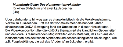 Note that a second version of the work exists featuring voice, strophonion and video. In this case the video functions as co-player on stage. To see the documentary of a live presentation during the show Tongues and Ghosts at the fabrik Potsdam go to this: Mundfundstücke: Das Konsonantenvokabular, for voice, strophonion and video.