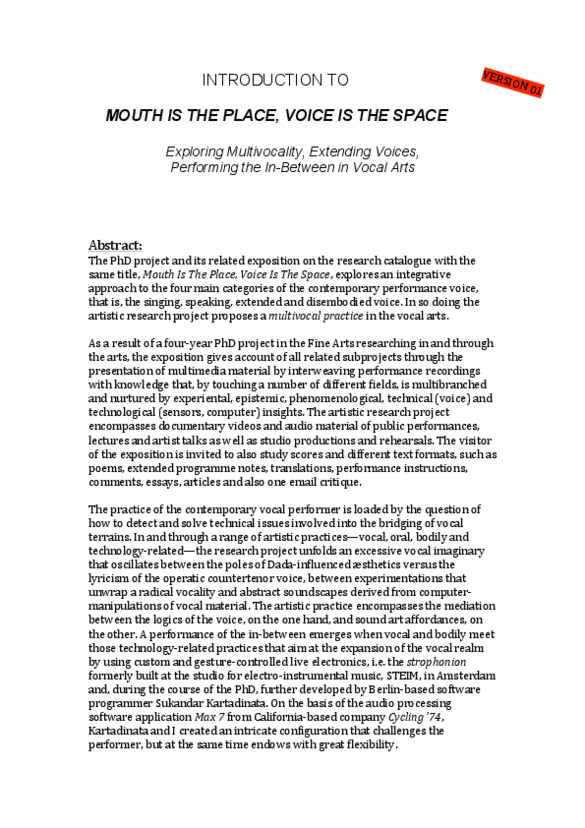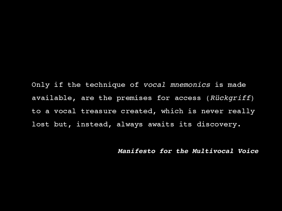 The aim of this artistic research project is to find strategies to extend the voice paradigms by elaborating on both the vocal and the oral sphere. The multivocal voice is an aesthetic concept that fosters an integrative approach to vocal performance practices rather than excluding one or the other from the scope of the above mentioned voice categories. At the same time, the performer is to be stimulated by the negative affordance of ‘not repeating the past’. The notion of multivocality therefore indicates various modes of new kinds of virtuosity, all of which are informed by an artistic knowledge that is multi-faceted regarding its methods, be it experimental or experiential, technical or technological, improvisational or compositional. The multivocal practitioner does not only expand the discipline of vocal arts as such, but also goes beyond that by integrating and merging with other forms of expressions including sound art and bodily practices.
