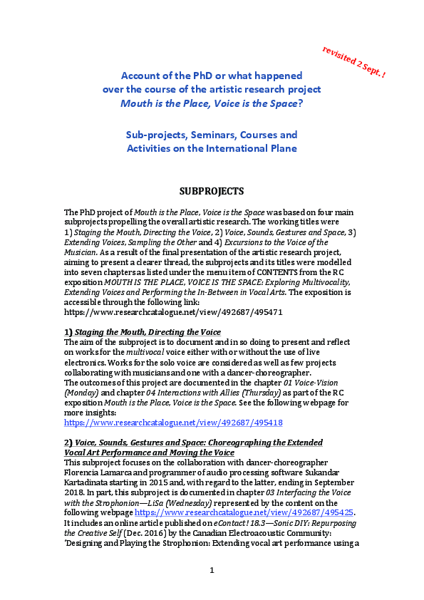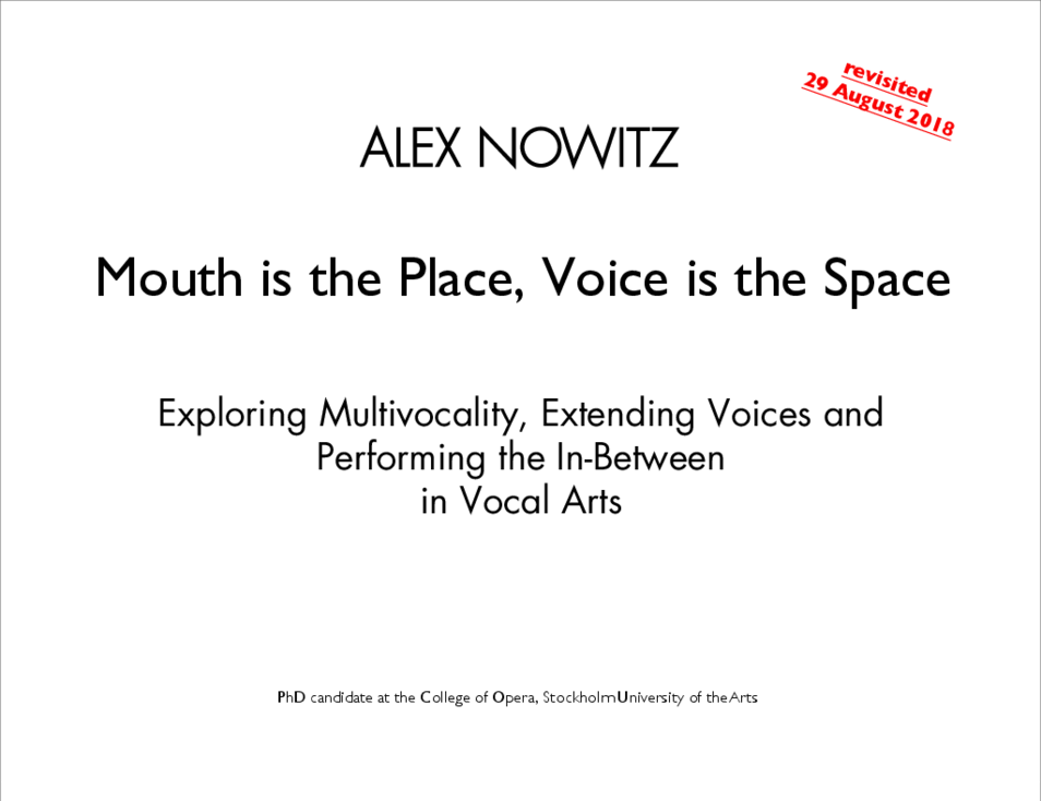 Proposing a ‘multivocal practice’ in the vocal arts, this exposition (documented artistic research project) embodies an inclusive approach to four core categories for the contemporary performance voice: the singing, speaking, extended and disembodied voice. The culmination of a four-year PhD project in Artistic Practices (Performative and Mediated Practices, with specialisations in choreography/film and media/opera /performing arts), it documents artistic research sub-projects through the presentation of multimedia material, interweaving performance recordings with reflective and contextualising texts. Multivocality addresses various models of virtuosity, all of which are informed by a multi-faceted artistic knowledge, whether experimental or experiential, technical or technological, improvisational or compositional. Contemporary vocal performance practices are loaded by questions pertaining to detecting and solving technical issues that span the vocal domains. Through a range of artistic practices—vocal, oral, bodily and technology-related—the research project unfolds what is conceived as a bountiful ‘vocal imaginary’. When voice and body meet technology-related practices that aim at the expansion of the vocal realm by using custom and gesture-controlled live electronics, a performance æsthetics of the in-between emerges. This is explored via the ‘strophonion’, formerly built at STEIM in Amsterdam and, during the course of the PhD, further developed by Berlin-based software programmer Sukandar Kartadinata who created an intricate configuration on the basis of the audio processing application Max/MSP. Through the formulation and performance of ‘The Manifesto for the Multivocal Voice’—a ‘discursive solo performance act’ that aims to provide insights into principles and premises, and to develop the discourse on the politics of today’s performance voice—the exposition attempts to establish a potential theoretical and philosophical grounding for multivocality. Its second major concern relates to the poetics of the voice, investigating the thresholds of highly individualised vocal practices by asking: what are the boundaries of the contemporary performance voice? The exposition (on the Research Catalogue) comprises video and audio documentation of public live performances, lectures and artists’ talks as well as studio productions and rehearsals. The user is invited to study scores and various texts, such as poems, extended programme notes, translations, performance instructions, comments and other reflections. The collection of essays and articles that guide the user through the edifice of ideas that the artistic research project has unveiled remains central to the endeavour.