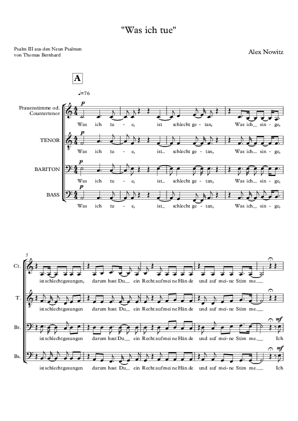 Thomas Bernhard is the author of the poem Was ich tue, ist schlecht getan being part of the collection Neun Psalmen [Nine psalms]. In 2001 I composed the music for four male voices as part of the overall composition Drei Psalmen. With regard to the artistic research project Extending Voices, Sampling the Other together with the Auditivvokal Dresden, I adapted the composition for two female and three male voices.