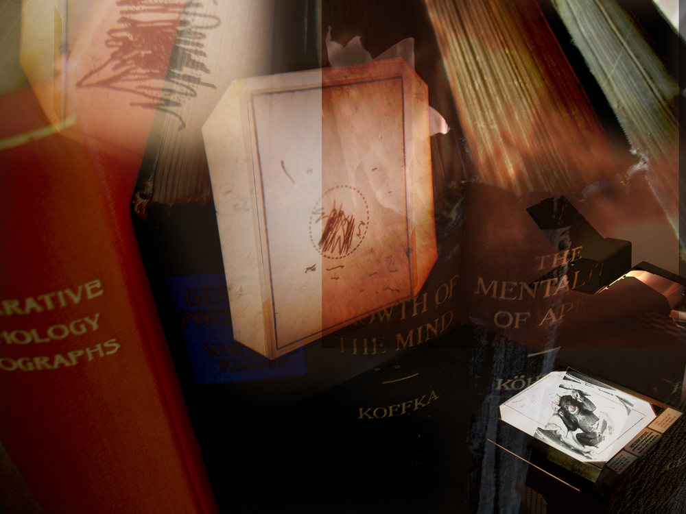 The ethical issues regarding the use of nonhuman animals in laboratories, and the multiple values that underpin it, are of general significance. As with much art-practice research there is an underlying philosophical, psychological, or sociological problem that is too big to resolve (except collectively with other researchers) but nevertheless remains an issue and informs the research process. In ‘Collecting’, I describe the method by which I approached the scientific discourses that formed the context to Alpha’s story: I amassed a collection of outdated psychology books. This allowed me to handle the objects of this disciplinary knowledge and look for places where ambivalent attitudes to nonhuman animals are revealed and human/animal distinctions made. Although I do not discuss it at length here, my study of this historical material has led to conference papers (MacDonald, 2012b, 2013), and I have participated in current interdisciplinary debates on the ethics of animal experimentation. However, my intention here is to concentrate on the more artistic methods and outcomes of my approach to this material.
