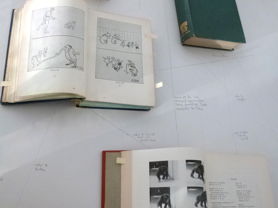 The books that I gathered are fading and discolouring, their pages are becoming brittle, but they present to me extraordinary visions. For example, there are a striking number of diagrams that show apparatuses such as mazes and puzzle boxes in which small animals could be observed in their efforts to obtain food or avoid electric shocks. I am impressed by the power to make such diagrams and thereby enact a geometry in which the experimenter observes from overhead while the test subject is held perplexed within an elaborately constructed, miniature environment. Captured within the close-set text are descriptions of outlandish procedures and convoluted testing scenarios. Artistic research has the capacity to make strange these demonstrations, to bring into question the knowledge they deliver to other disciplines (for example, theories of perceptual psychology that have influenced artists and philosophers), and to delve into their subconscious baggage. An objective of artistic research might be to probe further into the mechanics of conflicting values and divided subjectivities – for example, those exhibited in the dual relationships between companion animal/test subject and human caretaker/observer.