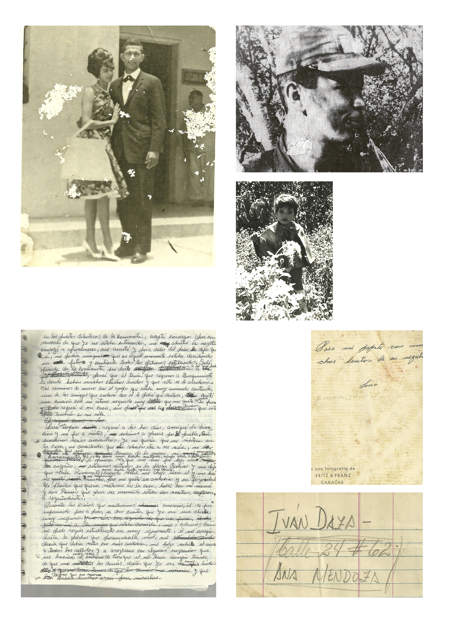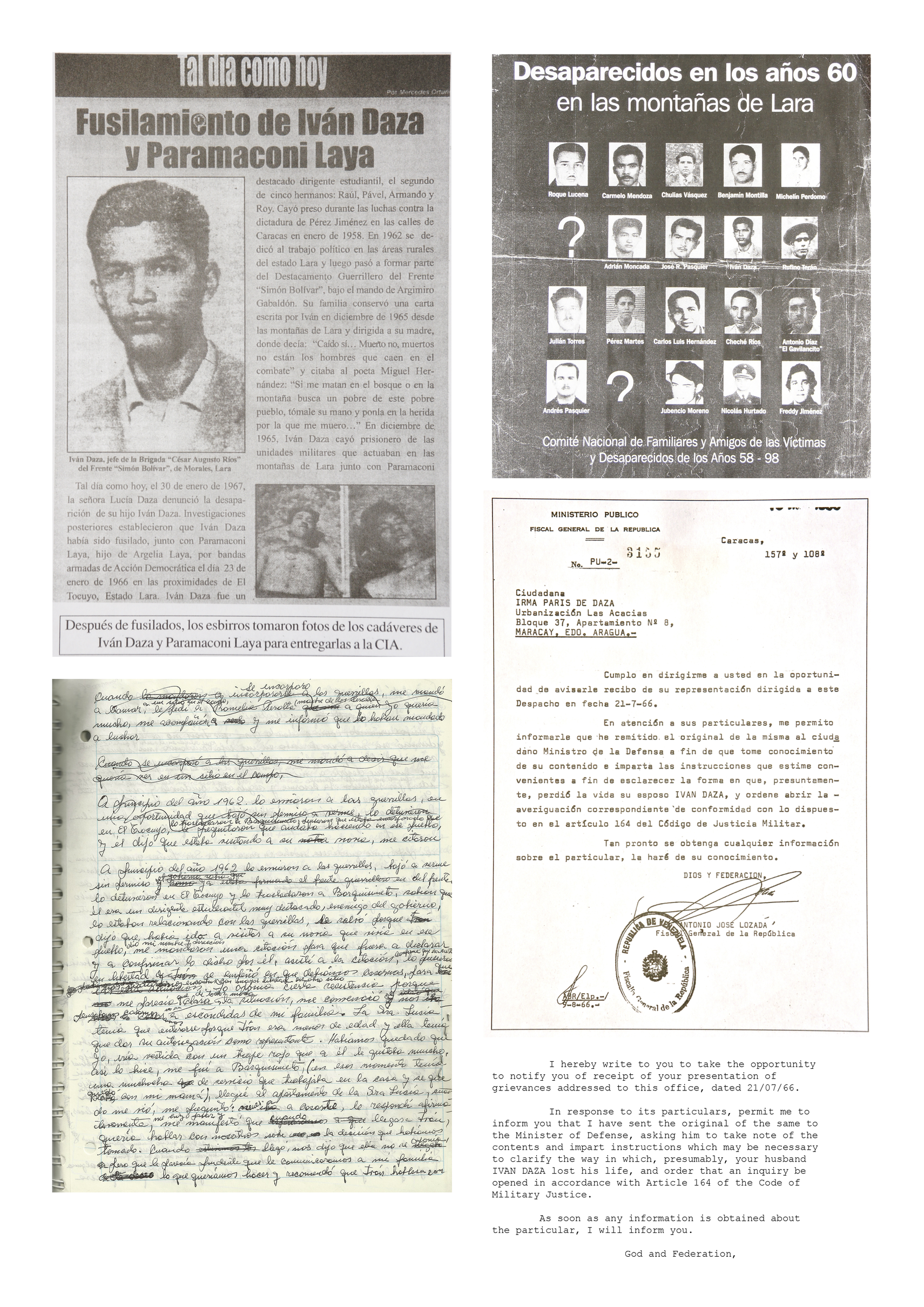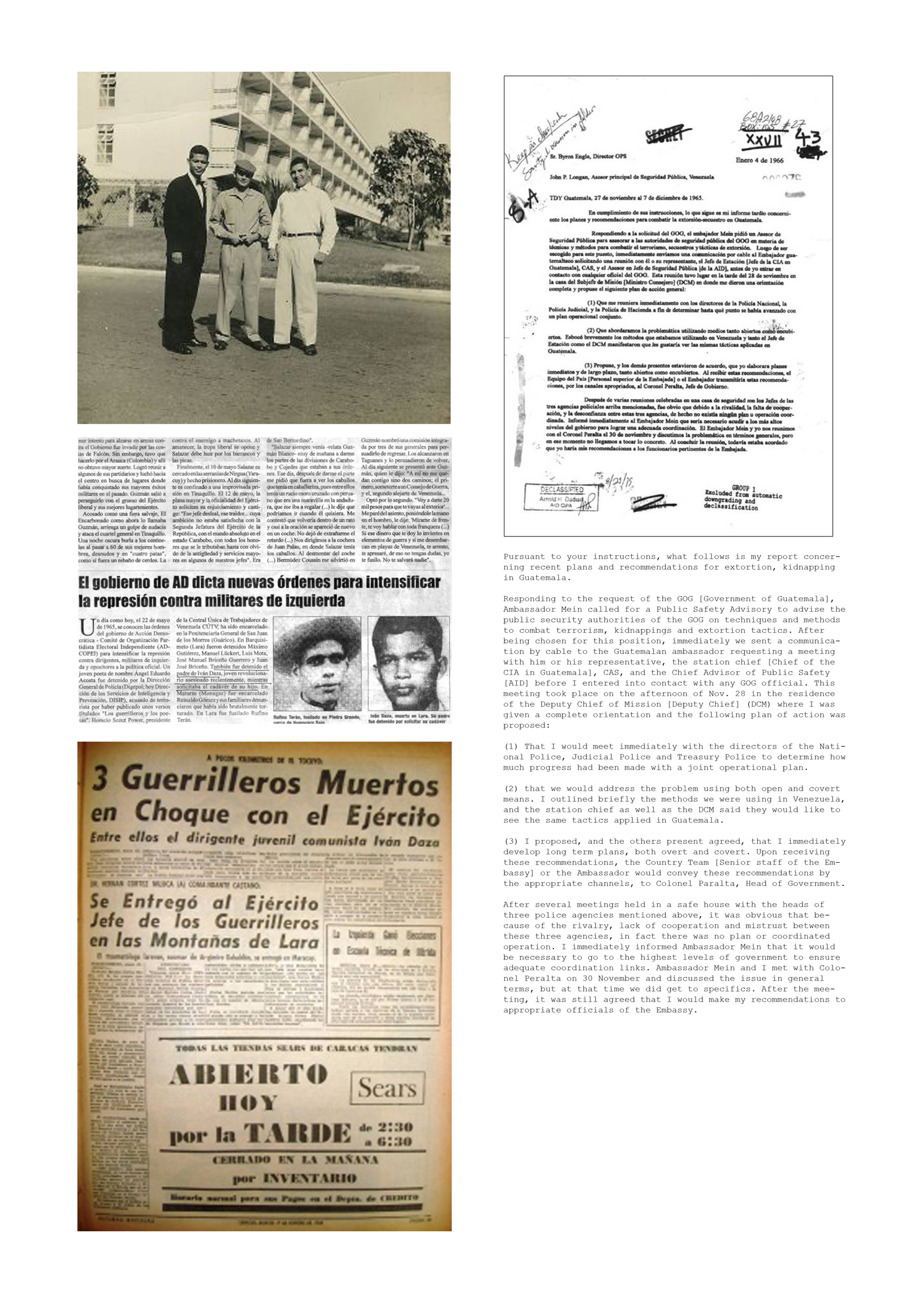 The images below are a collection of newspaper clippings and related documents, some from primary sources. In the first compilation, the image from left to right, there is a photo of my father Iván Daza (in the black suit) with his brothers, at the Universidad Central de Venezuela (circa 1965).