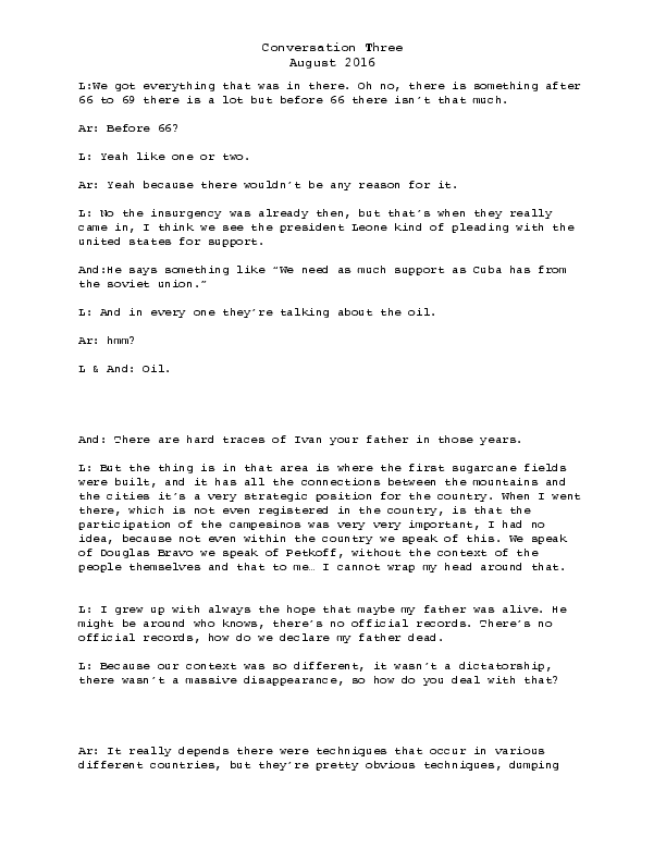 I grew up in Venezuela during a period where state-organized violence impacted directly on my family, causing vivid loss and horror. Because of my family’s active and continued participation in left-wing politics, it was necessary for us to maintain a low profile; speaking openly about my father was not an option. For much of my life, there was uncertainty about whether he, my father, had been politically disappeared or, perhaps secretly somewhere, alive.