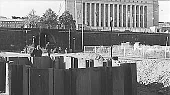Two overviews of Santiago Sierra's Person in a Ditch Measuring 300 × 500 × 300 cm, temporary work placed between Contemporary Art Museum Kiasma and Parliament House in Helsinki, Finland, September 2001.