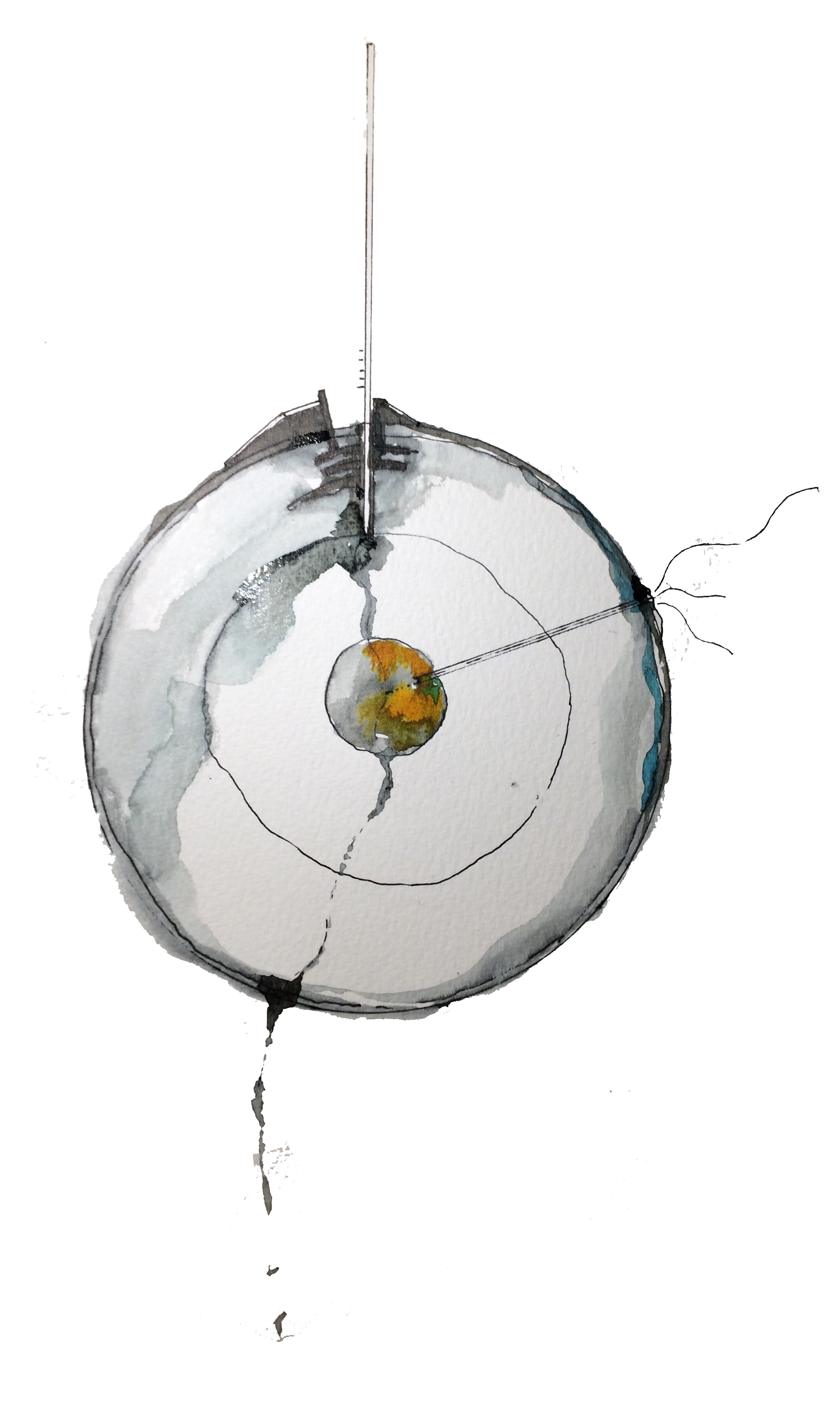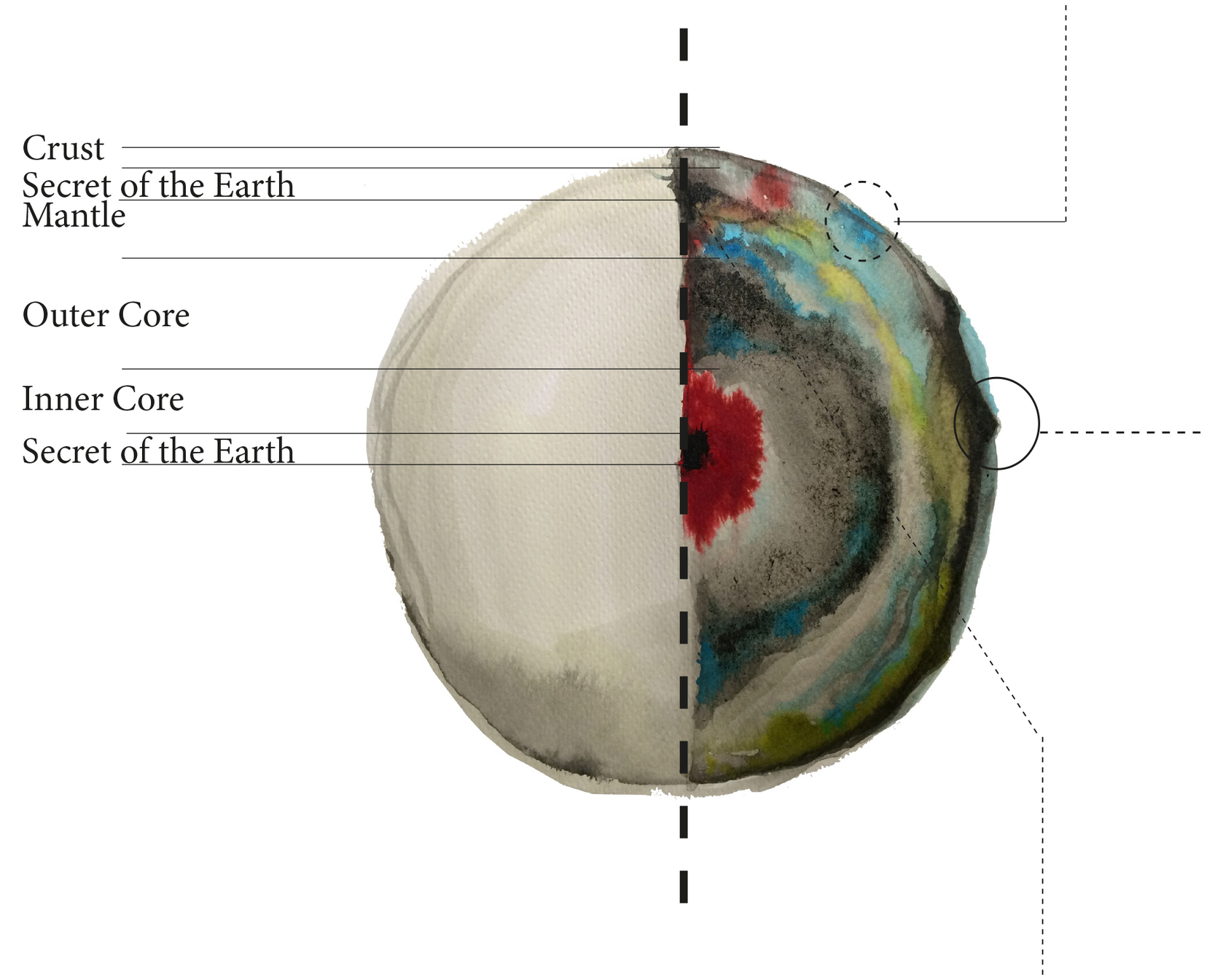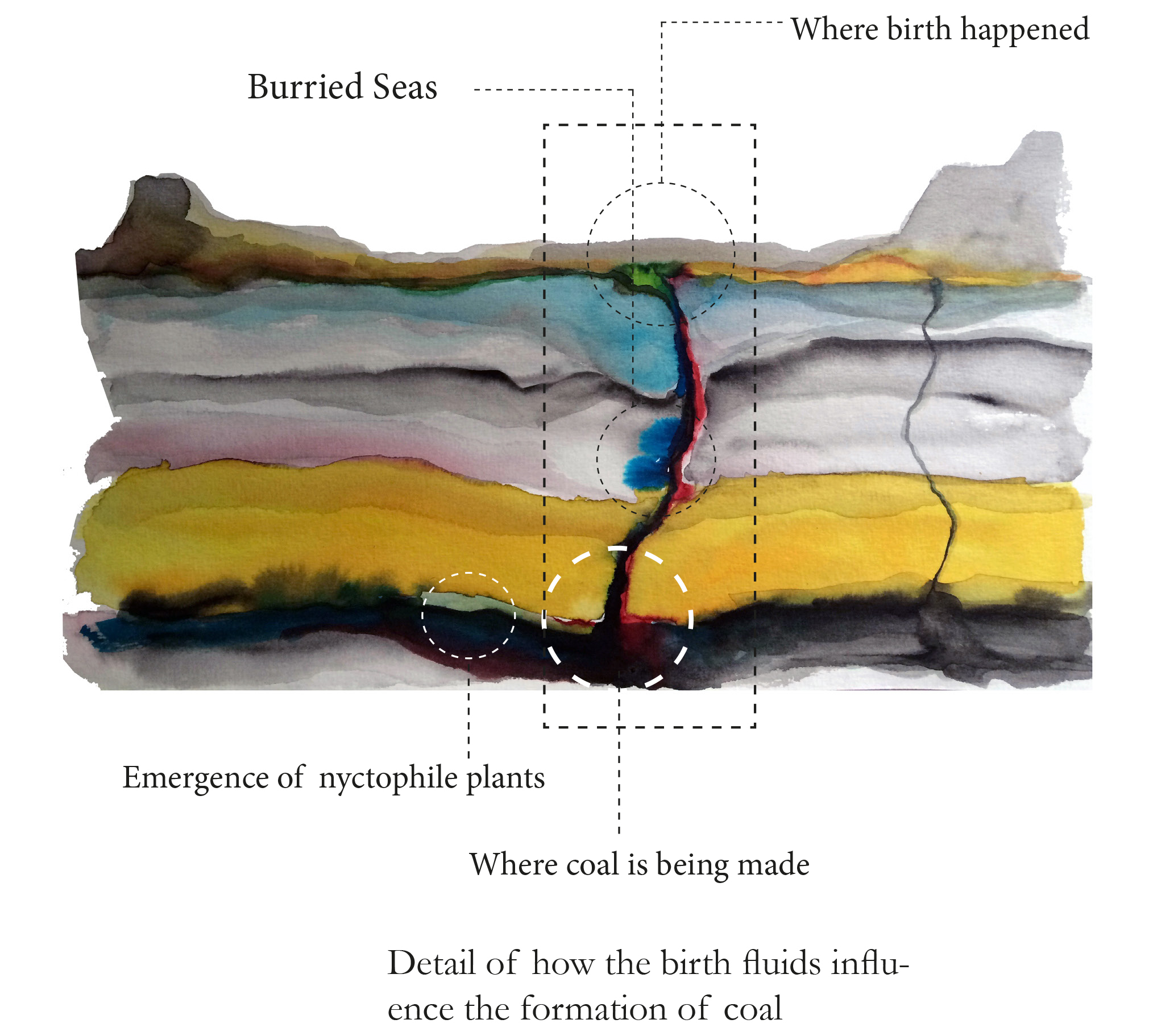 This work is exposed through a vertical storytelling, starting from the sky and descending deep into the coal mine. I have used imprecise drawings as the method of a performative storytelling, where imprecision and chance are a way of opening up possibilities for storytelling. Such imprecision, borrowed from the dissident architects of the Soviet era, where watercolours were used to challenge and question the State language of architectural representation,16 leads the story of the evolution of the Earth.
