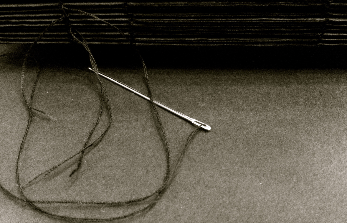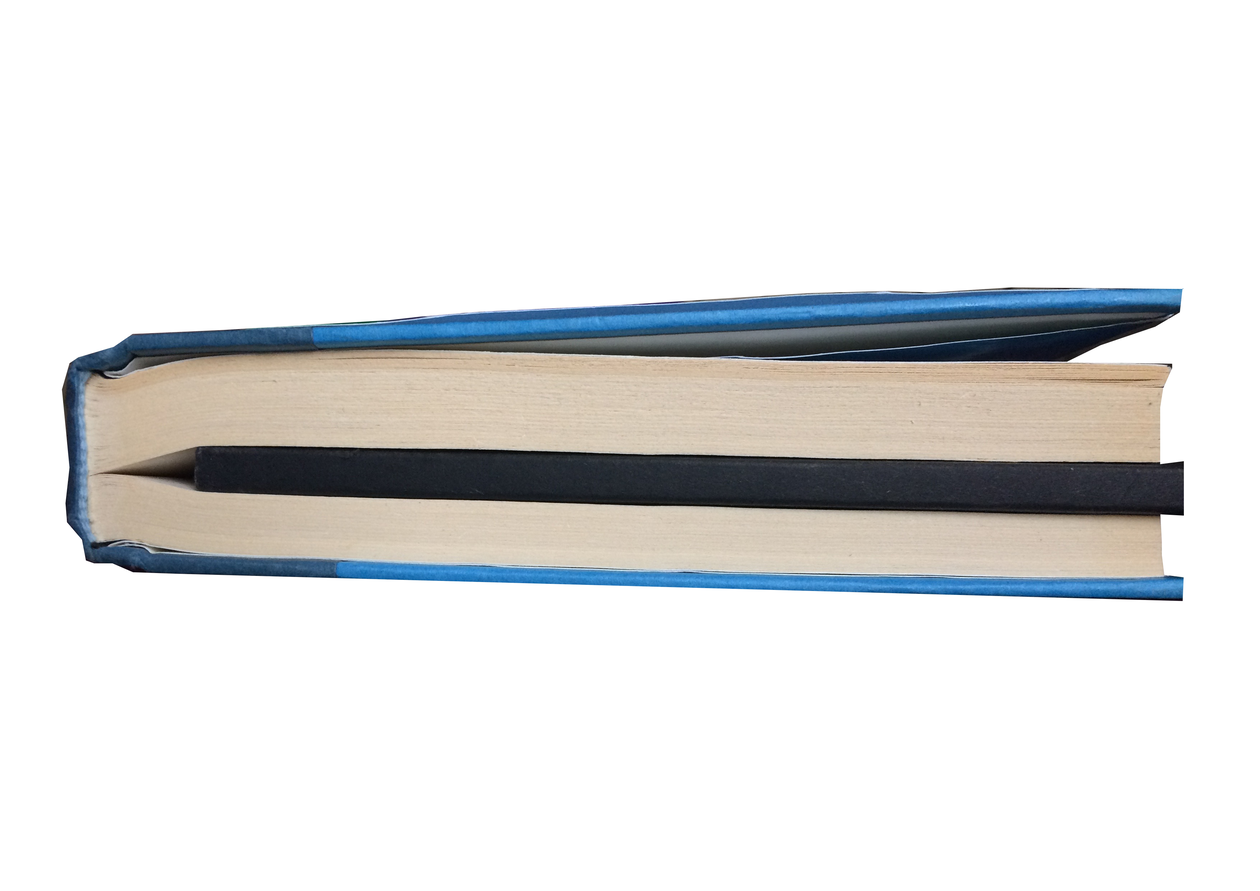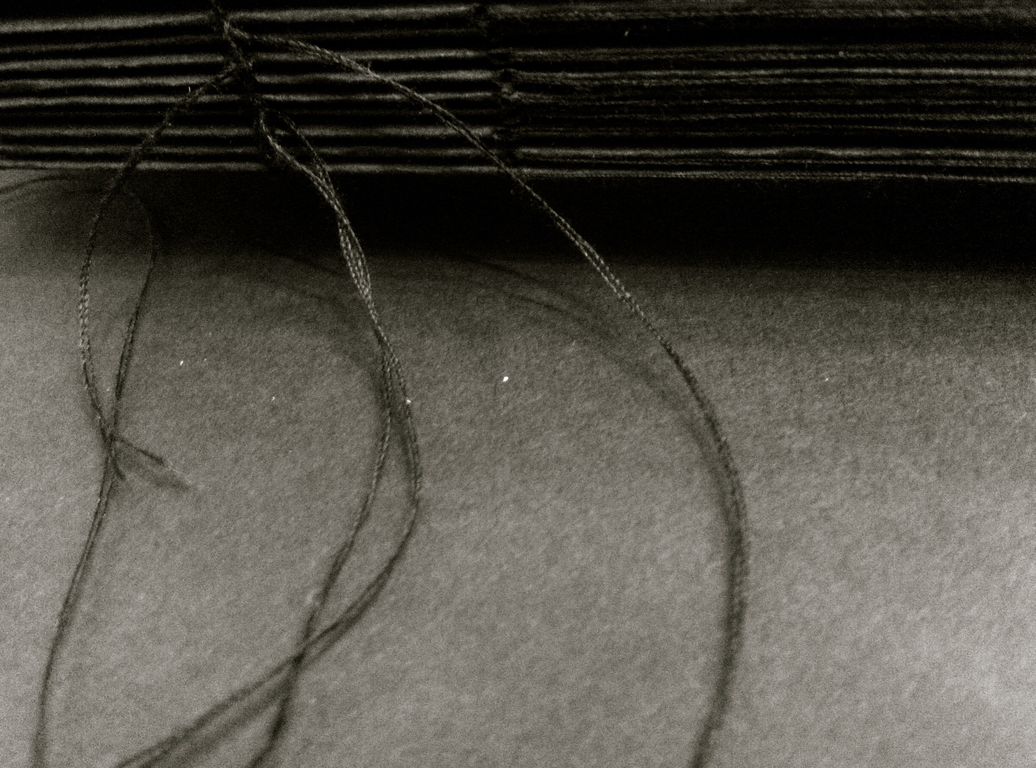 There is a rustling noise in the book’s spine as the pages move in the breeze. At the end of the third chapter ‘Black Earth’, after page 76, a black book grows out. A long black thread sews it to the spine of the book, and lays on the table in a casual manner. You pull the thread and the black book unfolds. Its pages are inscribed in black ink, glossy in the moonlight. With every flip of a page, black dust rises into the air and darkens the sight. A second later though, black words shine again on the black pages. The book starts in black, silence, or vanishing murmuring voices, getting lost in the dark material of the book.