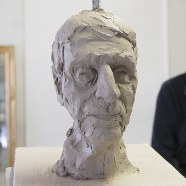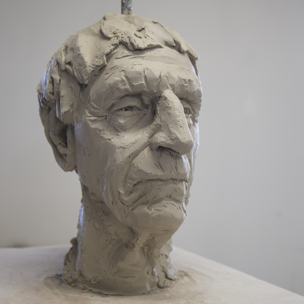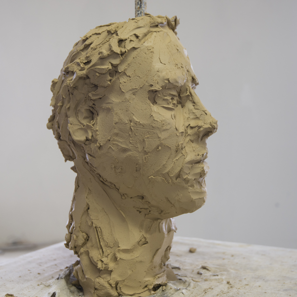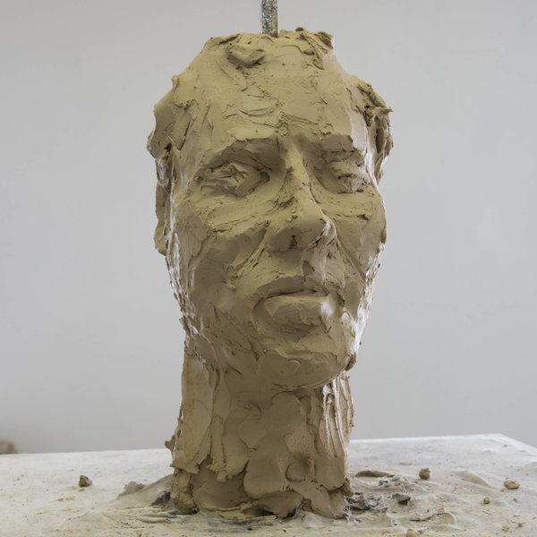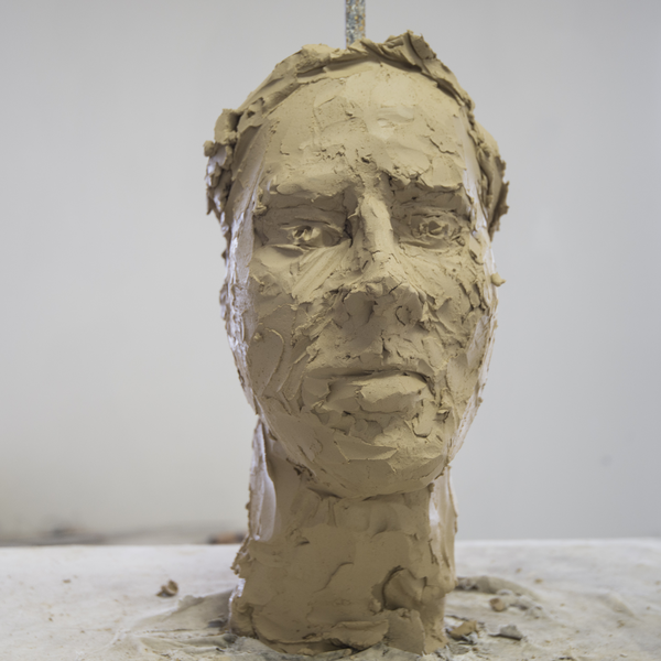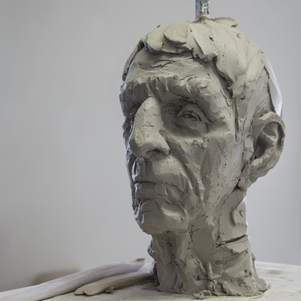 I take my time, concentrated and at length, to study my model's face from a distance, nearby and switching between proximity and distance. I use a piece of laminated chipboard covered with canvas and a metal bar mounted on top on which I apply the clay. In the beginning I try to grasp the contours and main form of the head as quickly as possible. I study and compare my sculpture with my model and try to get the big picture. I do not work with details until a rough sketch is done. But I tend to work on the left hand side first since I am right-handed the model's left hand side is easier to reach.