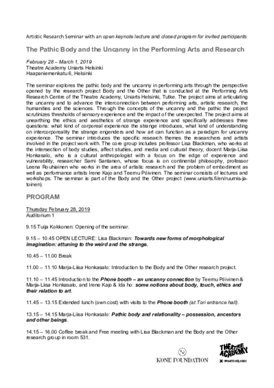 The seminar explores the pathic body and the uncanny in performing arts through the perspective opened by the research project Body and the Other that is conducted at the Performing Arts Research Centre of the Theatre Academy, Uniarts Helsinki, Tutke. The project aims at articulating the uncanny and to advance the interconnection between performing arts, artistic research, the humanities and the sciences. Through the concepts of the uncanny and the pathic the project scrutinizes thresholds of sensory experience and the impact of the unexpected. The project aims at unearthing the ethics and aesthetics of strange experience and specifically addresses three questions: what kind of corporeal experience the strange introduces, what kind of understanding on intercorporeality the strange engenders and how art can function as a paradigm for uncanny experience. The seminar introduces the specific research themes the researchers and artists involved in the project work with. The core group includes professor Lisa Blackman, who works at the intersection of body studies, affect studies, and media and cultural theory, docent Marja-Liisa Honkasalo, who is a cultural anthropologist with a focus on the edge of experience and vulnerability, researcher Sami Santanen, whose focus is on continental philosophy, professor Leena Rouhiainen who works in the area of artistic research and the problem of embodiment as well as performance artists Irene Kajo and Teemu Päivinen. The seminar consists of lectures and workshops. The seminar is part of the Body and the Other project (www.uniarts.fi/en/ruumis-ja-toinen).