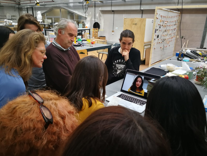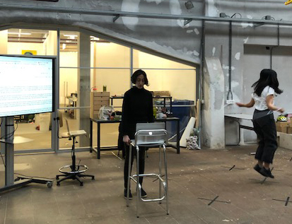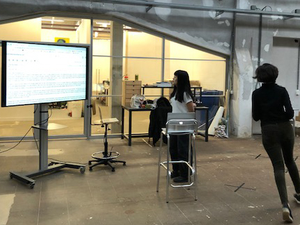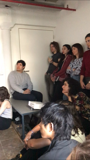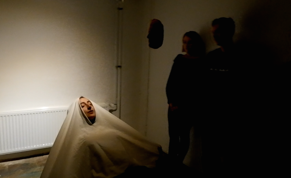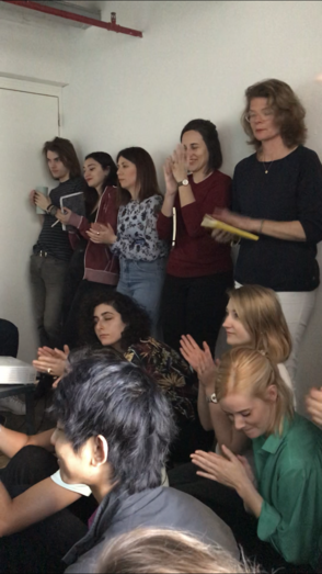 Within the presentation of my artistic research, I gather peers into the black-box situated in the southern part of the studio. From the dark space they walk into the working area, and in the direction of the main gathering table where I stand awaiting. There is chanting of the Holy Friday Maronite mass resonating from the mezzanine above the black-box. As the group organizes in a queue, I hand in a 'HKU' branded post-it to each participant with the question: