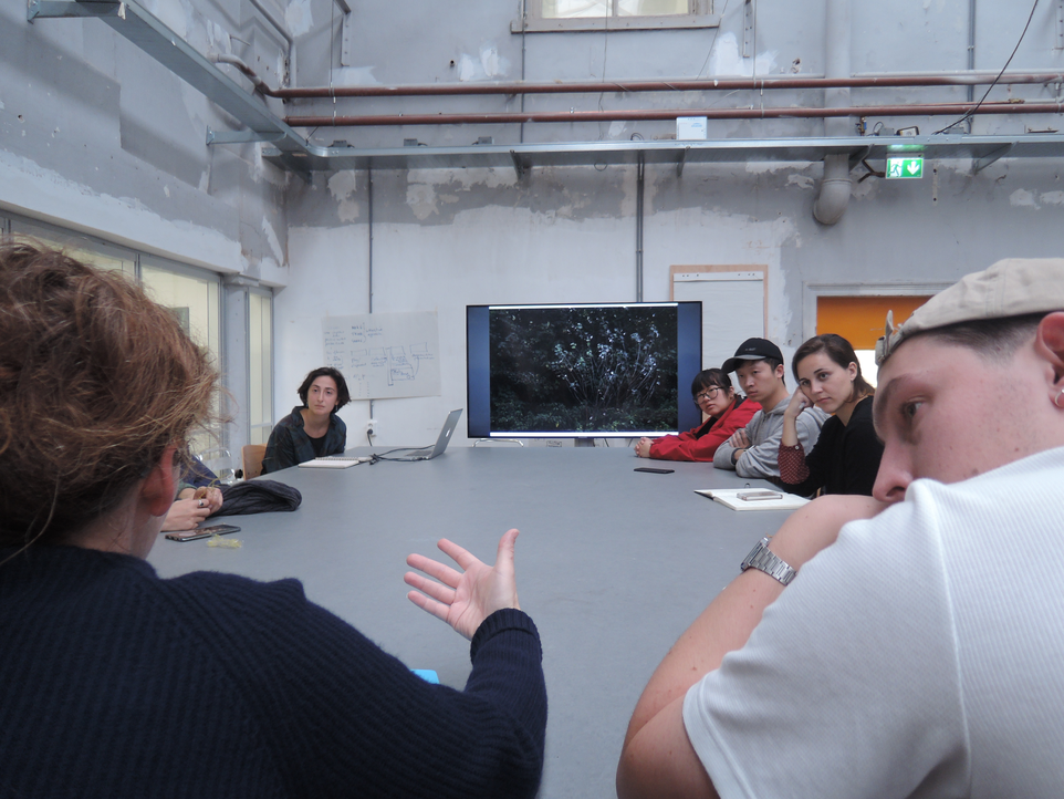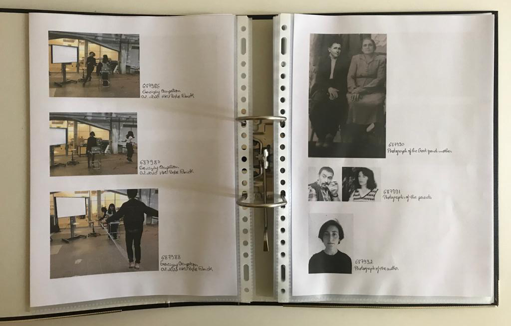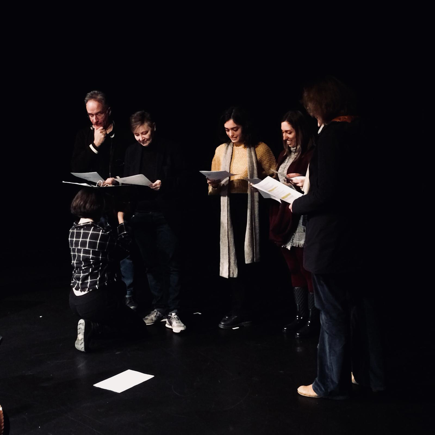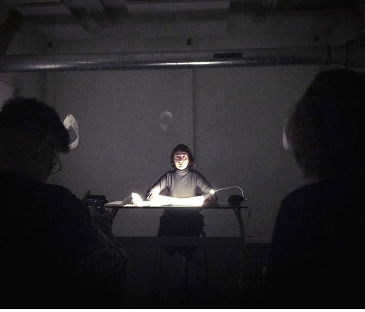 One by one, the papers are picked up again and read aloud to the now playing version of my previously recorded self. I am reading the first page of my notebook simultaneously with the last page being read on the screen. The atelier is tentatively located in the action of self-documentation.