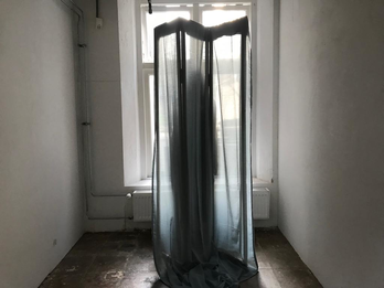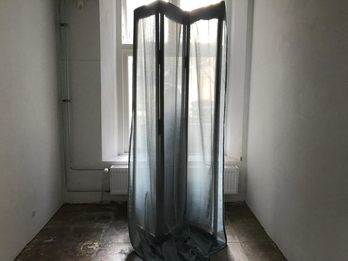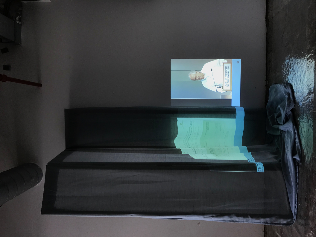 Taking the role of a biased stenographer, I selectively take note of the words used by Kentridge as he describes the artistic process. The video footage to which I respond is screened in a 7 square meter room where visitors are tightly gathered. I stand behind a curtained paravent on which part of the YouTube lecture is projected. My silhouette appears behind the curtain; typing on my laptop that sits on a podium table. Above the image of Kentridge, the text I type appears as his live speech annotation. The selected choice of words is reorganized to form a new discourse.