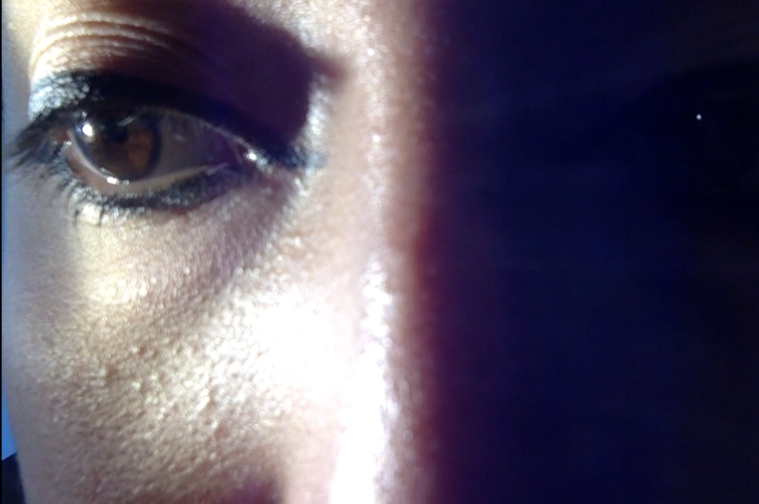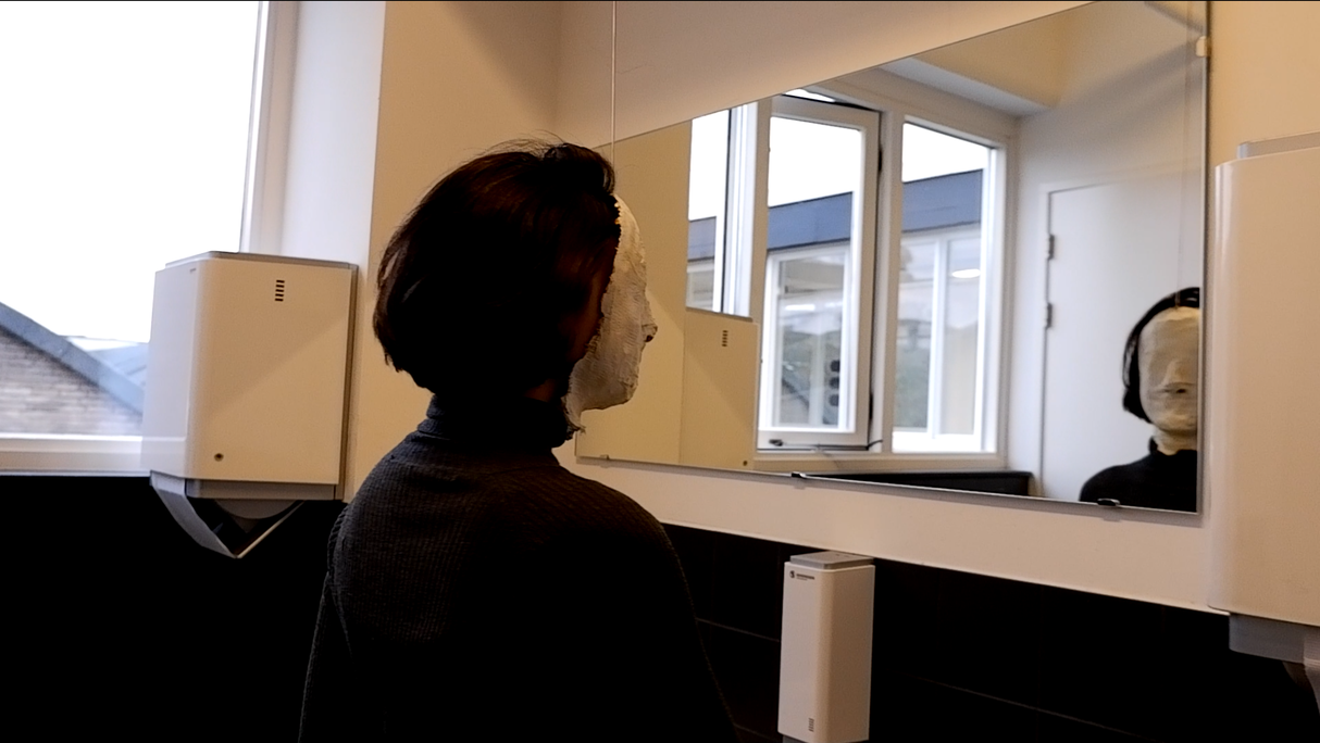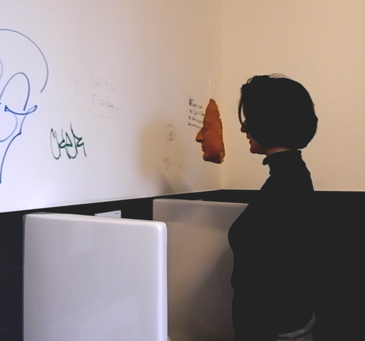 I chose then, to quote my face, to interrupt its action by making a cast of it. The outcome is the extraction of a specific facial gesture. The mask, silicone and detailed replica of my face presents myself to myself at a distance. Here, above me, hangs a frozen moment in time of my physical features.