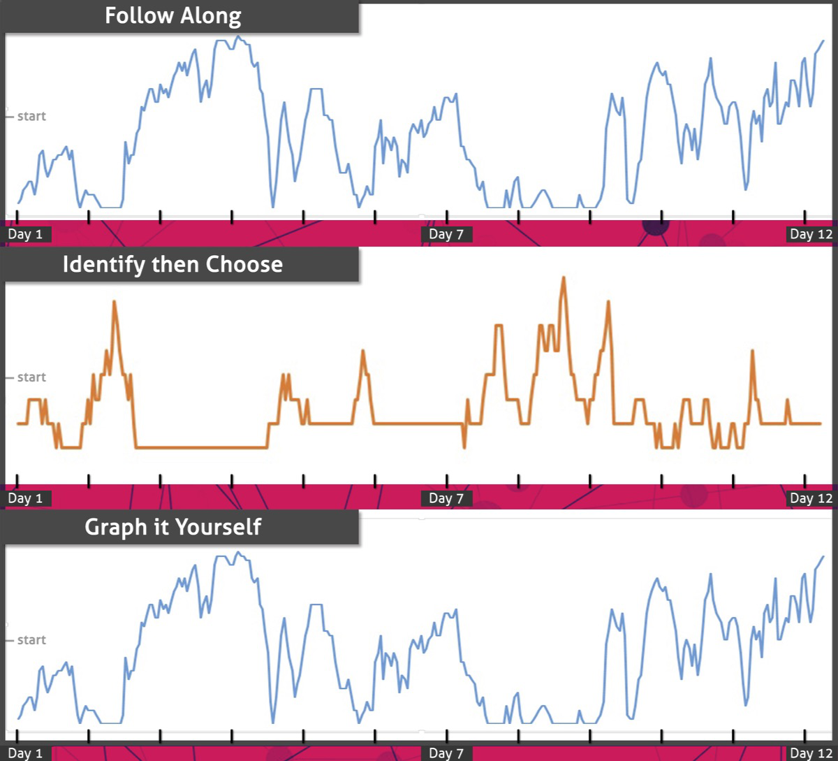 The first task involved following along on a visual graph while listening to the values of ozone over 12 days, compressed into 1 minute of audio. The second task involved listening to a combination of carbon monoxide and sulphur dioxide, sonified together at the same resolution – 12 days into 1 minute of audio – in order to identify which of the two is portrayed on a visual graph. The third task involved listening to a mix of carbon monoxide and ozone sonified together; while the ozone graph was provided, participants had to graph carbon monoxide levels by hand. The motivation for this activity was to provide opportunity for individual listening evaluation within the format of a focus group and to engage participants in the constructive task of graphing as well as listening in order to generate a more rich discussion of the way participants perceived detail in the sonifications. Given the aim of the study – public perception rather than scientific analysis – our goal here was not to confirm hearability in the model but to probe how everyday listeners listen to data, which barriers to deeper understanding present themselves, and whether sonified data generates further interest in the social issues they may represent. Of course, we are aware that testing formats influence possible biases and that by using visual graphs we create certain limitations; however, the proliferation of common visualizations in the public domain offers an opportunity to probe how these two modalities complement (or not) each other in comprehension and reception of data by the public.