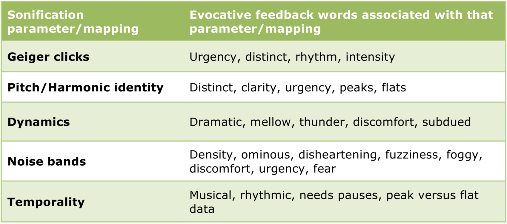 Aside from the PM2.5 clicks, the other most memorable and recognized element from both sonifications was the instance of clipping noise bands in the Toronto sonification (we decided to let pollution values drive noise band dynamics into a distortion range, towards a more emotive representation): those were referred to by several participants as “thunder” or “thunderbolts” and were experienced as quite dramatic. In general – and not surprisingly – all participants perceptually identified frequency of clicks, higher pitched harmonic identities, and dynamics (in that order) as the most perceptually salient components of the sonification. Everyone considered the overall soundscapes to be fairly pleasant to listen to and could imagine listening to them for long periods of time. Both focus groups identified clarity of elements, such as distinct harmonic streams, and accents, such as clicks and “thunderbolts,” as important elements that worked to balance against a pleasant overall listening experience (see Figure 4 for details).