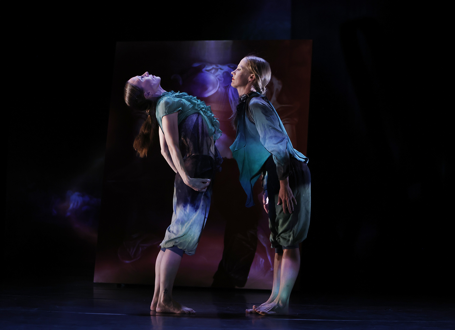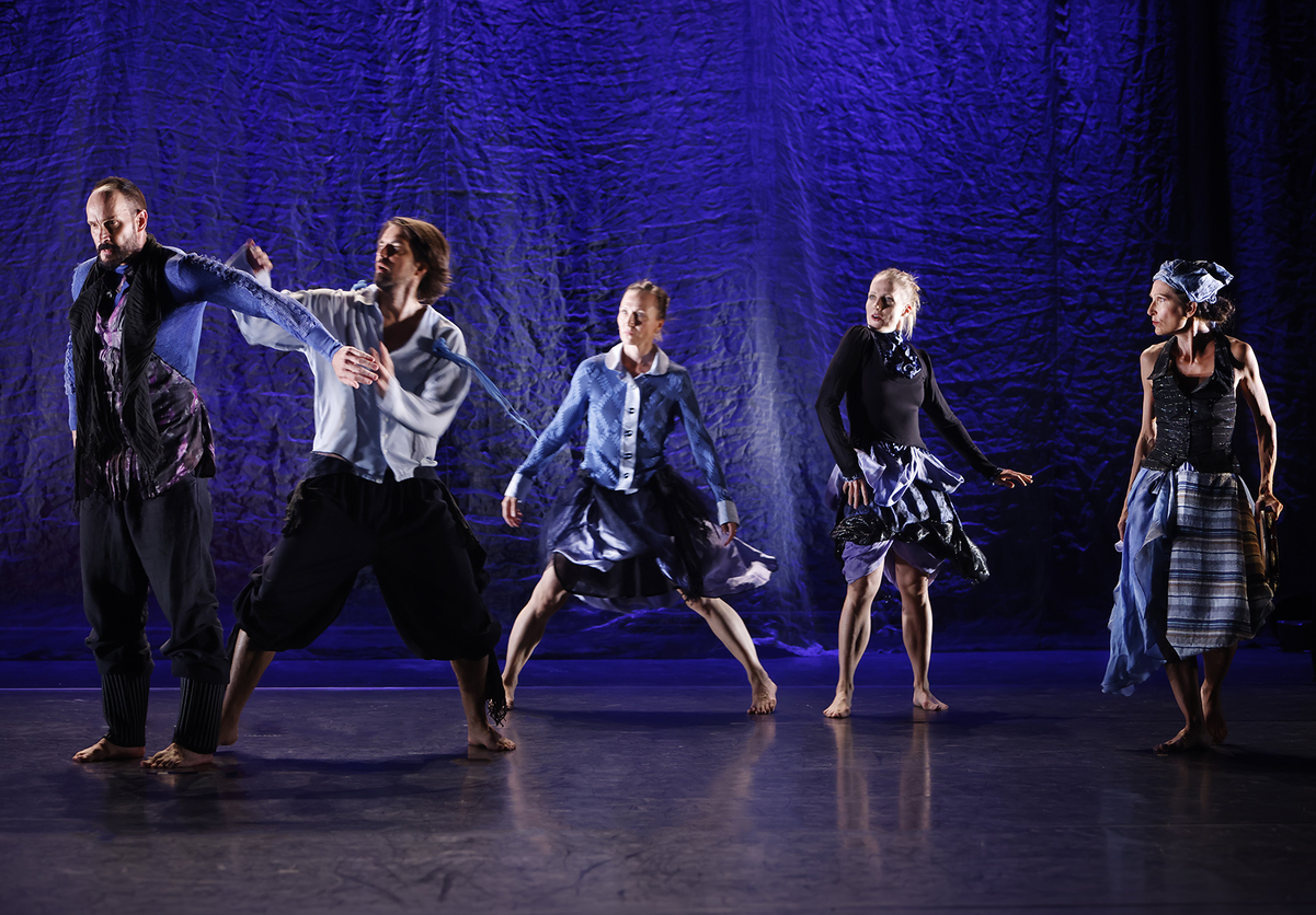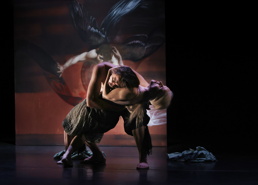 Sara Orava’s original paintings, inspired to Caravaggio’s Narcissus, The Seven Works of Mercy, and the Death of the Virgin, have been at the basis of Medusa, not only as part of the scenography but also as an inspiration for music and gestures. The text (in Latin, Greek, Italian, Finnish) was developed together with Sara and Piia Komsi, soprano coloratura/cellist – it was a long-haul project, started in autumn 2019. The working group included three musicians and five dancers.