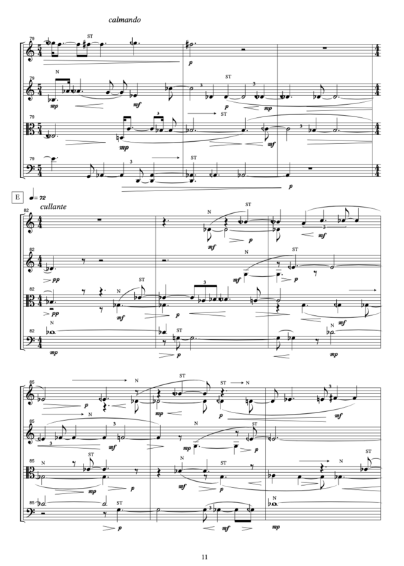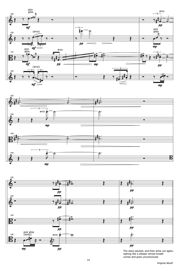 Onde for string quartet (2009-10) is freely inspired by Virginia Woolf´s novel The Waves. Every chapter begins with a poetic prose, where the author depicts with deep sensitivity and precision the inner landscape where the six characters live. The waves are more related to the inner world than to water world: a ceaseless movement of thoughts and feelings, through which gradually emerge the outer events of personal and collective life. Every character’s feelings, sensations and thoughts alternate, interweave and permeate each other, to form a subtly musical tissue. As Woolf says, everybody is manifold, in any of us ring the voices and thoughts of those who are present in our lives.