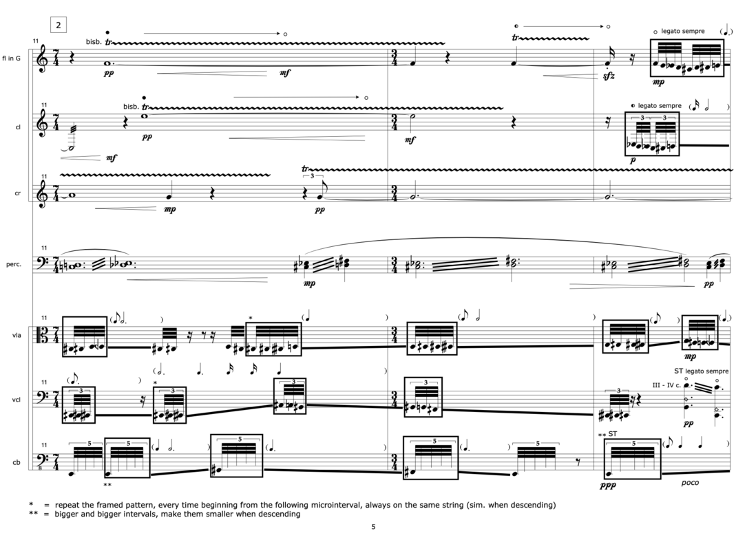 In between (2007) was inspired to the concept of ‘in-between’, dear to Hanna Arendt: it indicates what stays between two realities, two persons. But it is also relates to human voice, to communication. It may mean what unites, but also what separates. I imagined it as an almost physical space, an intermediate space where music happens: you can think about the ‘in-between’ between composer and world(s), composer and musicians, musicians and public and so on.